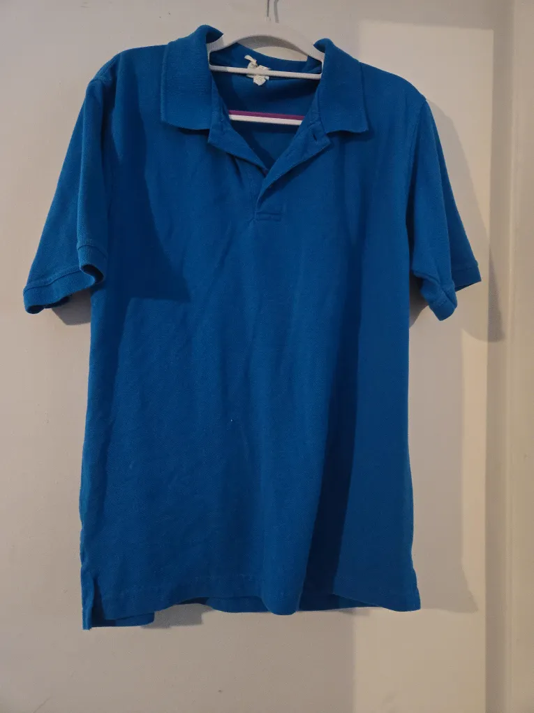 Classic blue polo shirt with a collar. Made from a comfortable cotton blend. Short sleeves and a relaxed fit. Great for casual wear!
