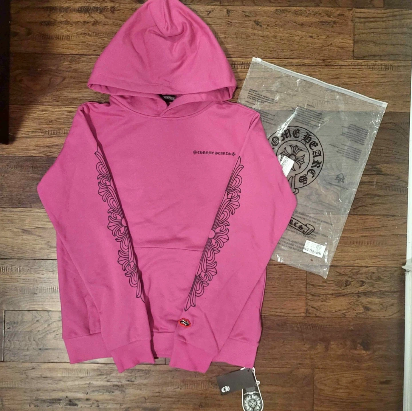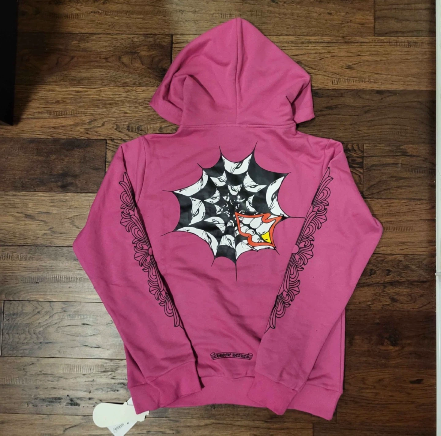 This is a Chrome Hearts hoodie. It's bright pink with a spider web design on the back and floral detailing on the sleeves. The brand logo is visible on the front.