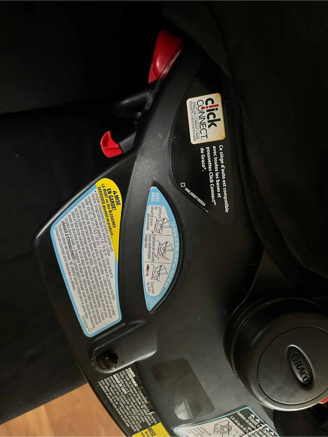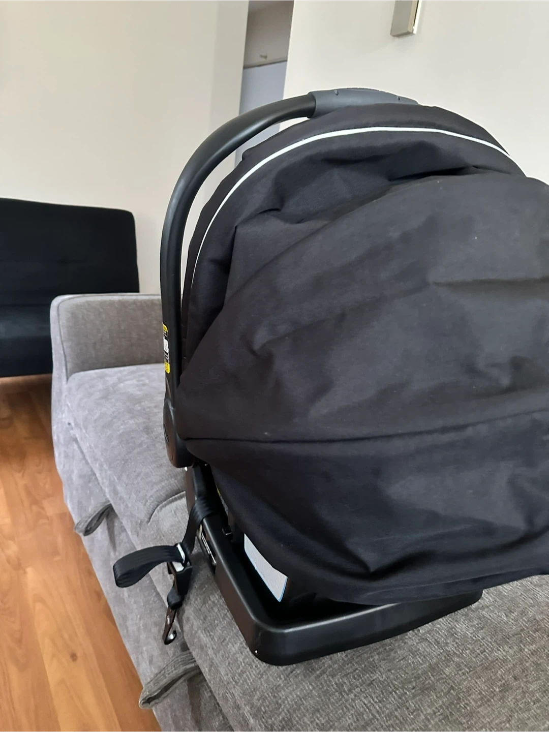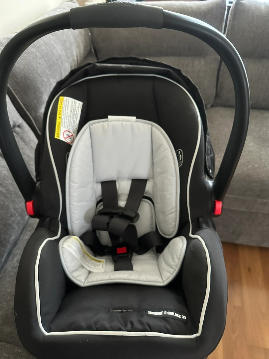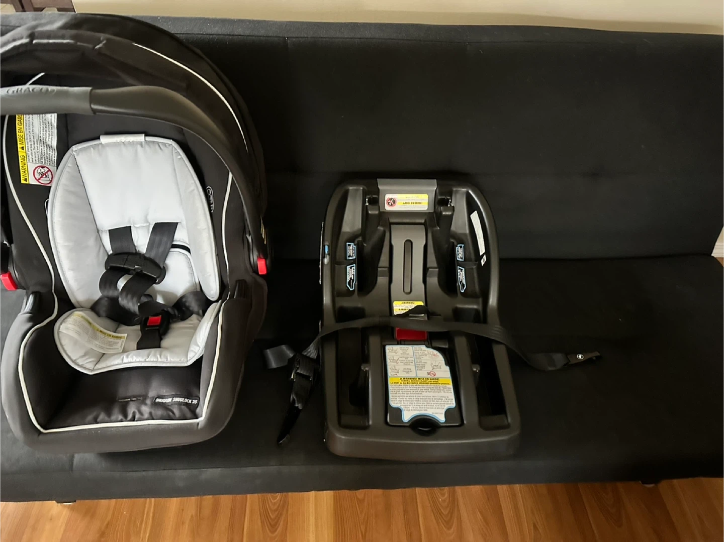 Black infant car seat and base. This car seat is designed for babies and includes a harness for safety. It's a Graco SnugRide 35 model. It's suitable for infants up to 35 pounds.