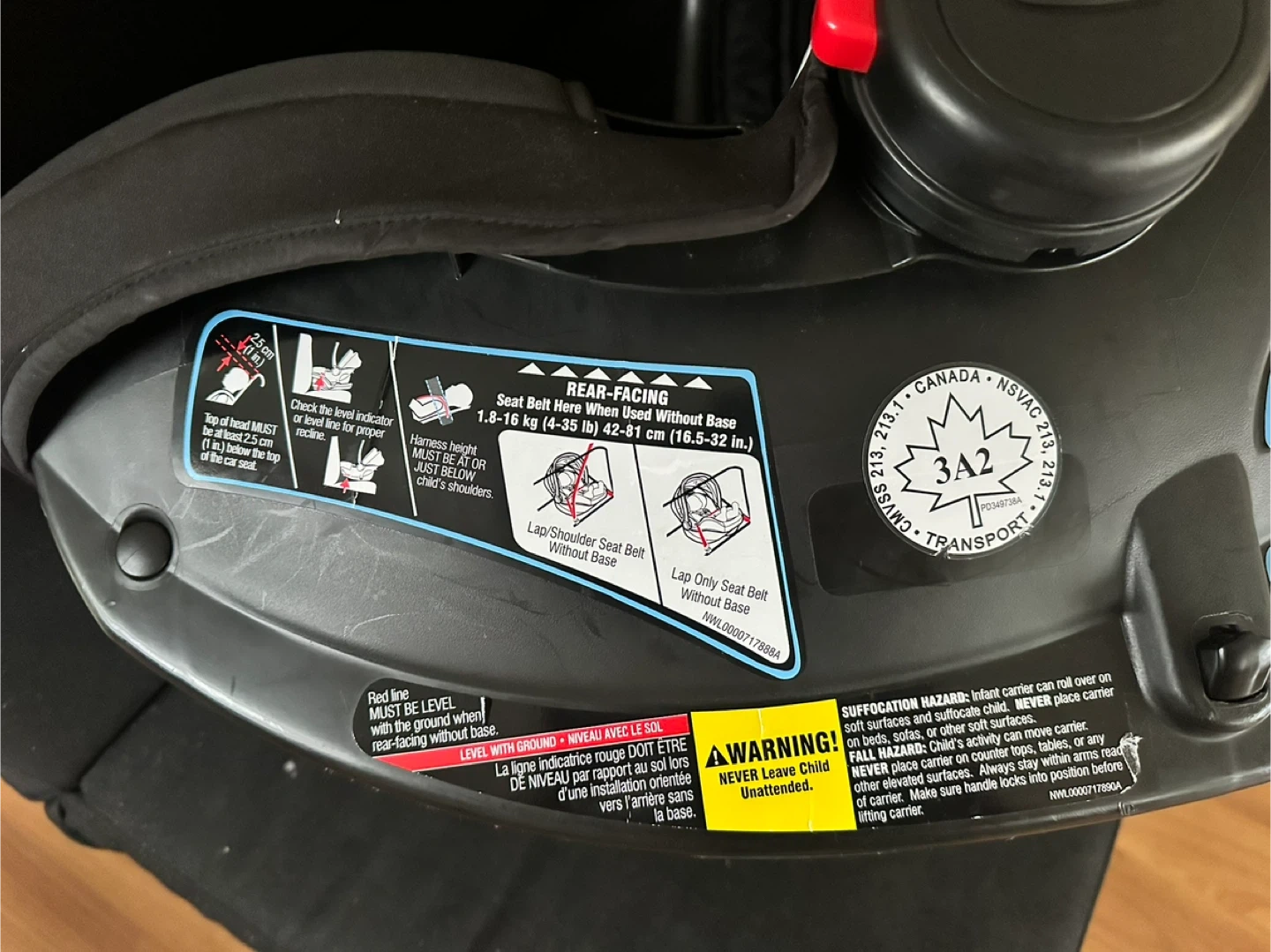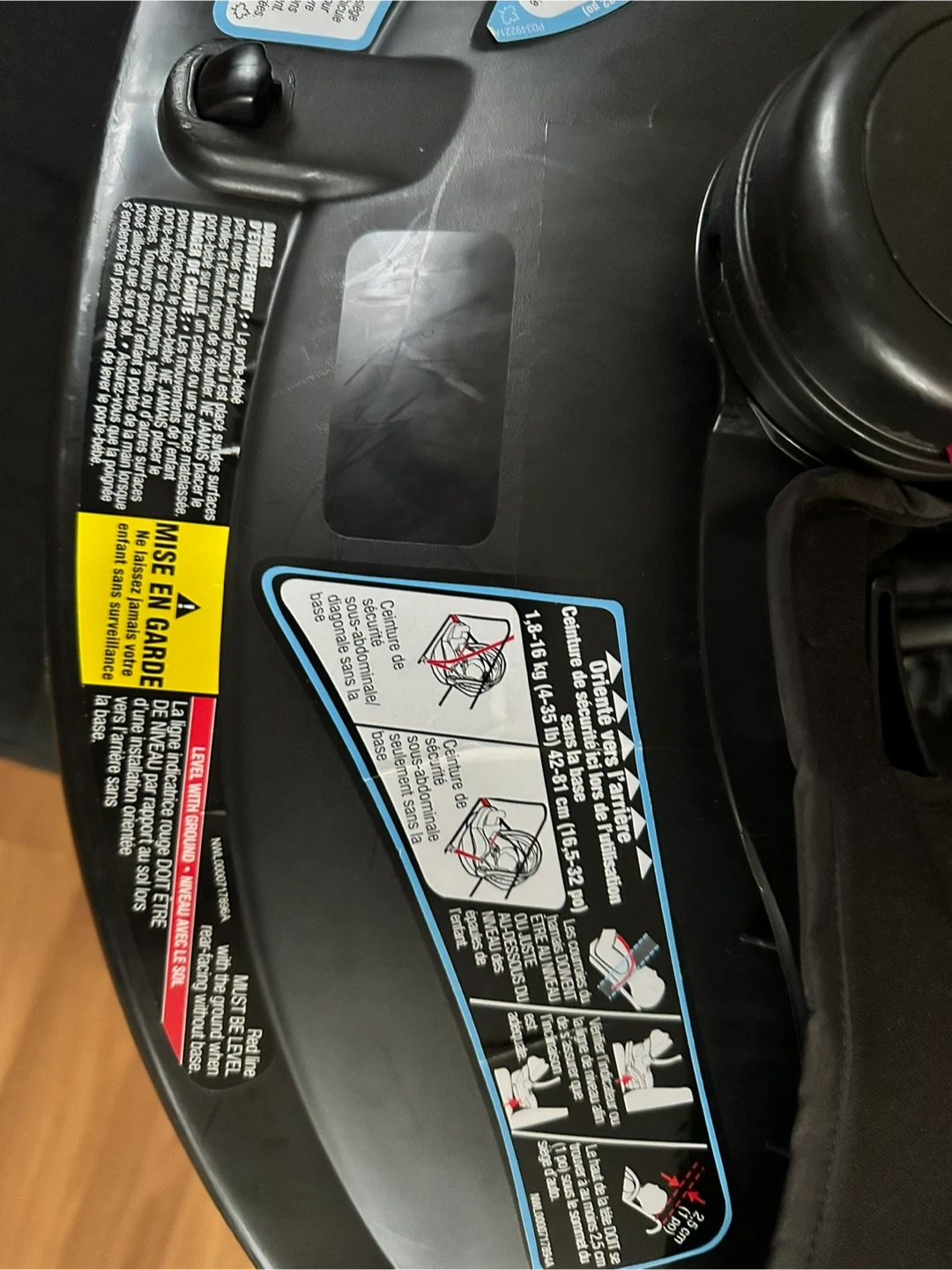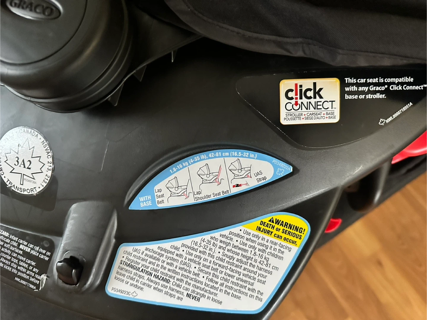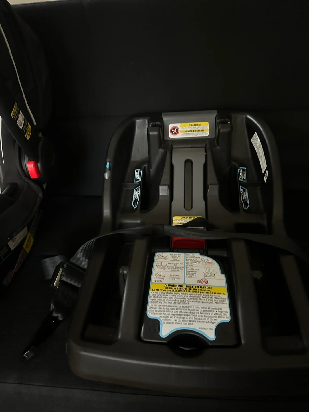 Black infant car seat and base. This car seat is designed for babies and includes a harness for safety. It's a Graco SnugRide 35 model. It's suitable for infants up to 35 pounds.