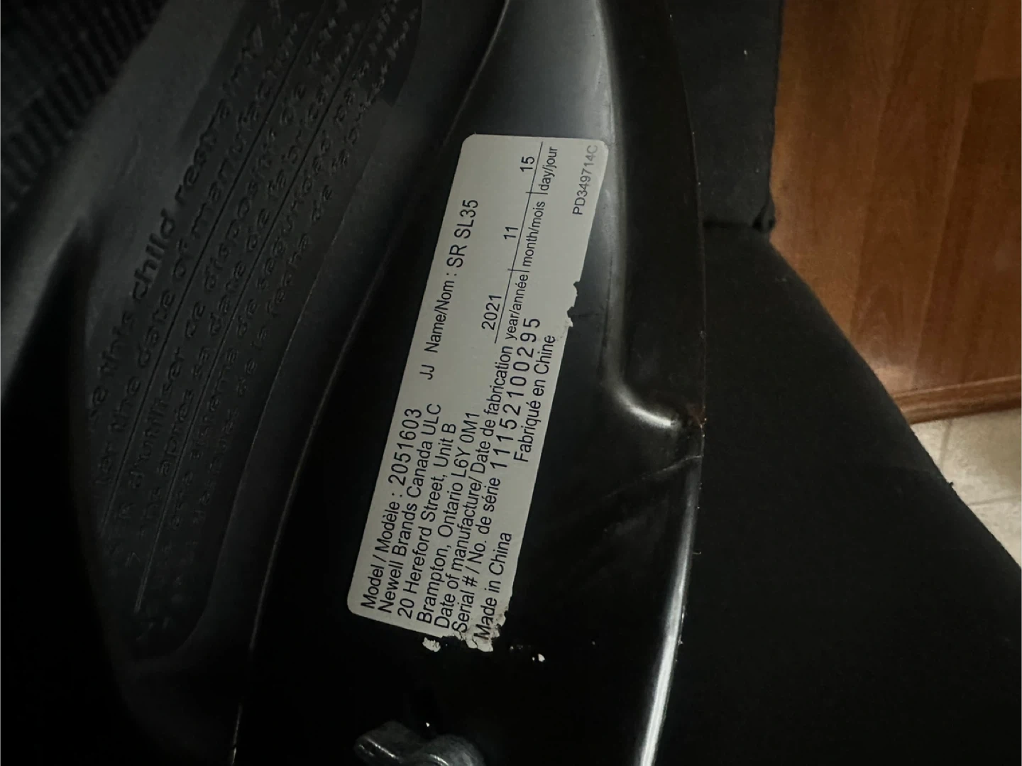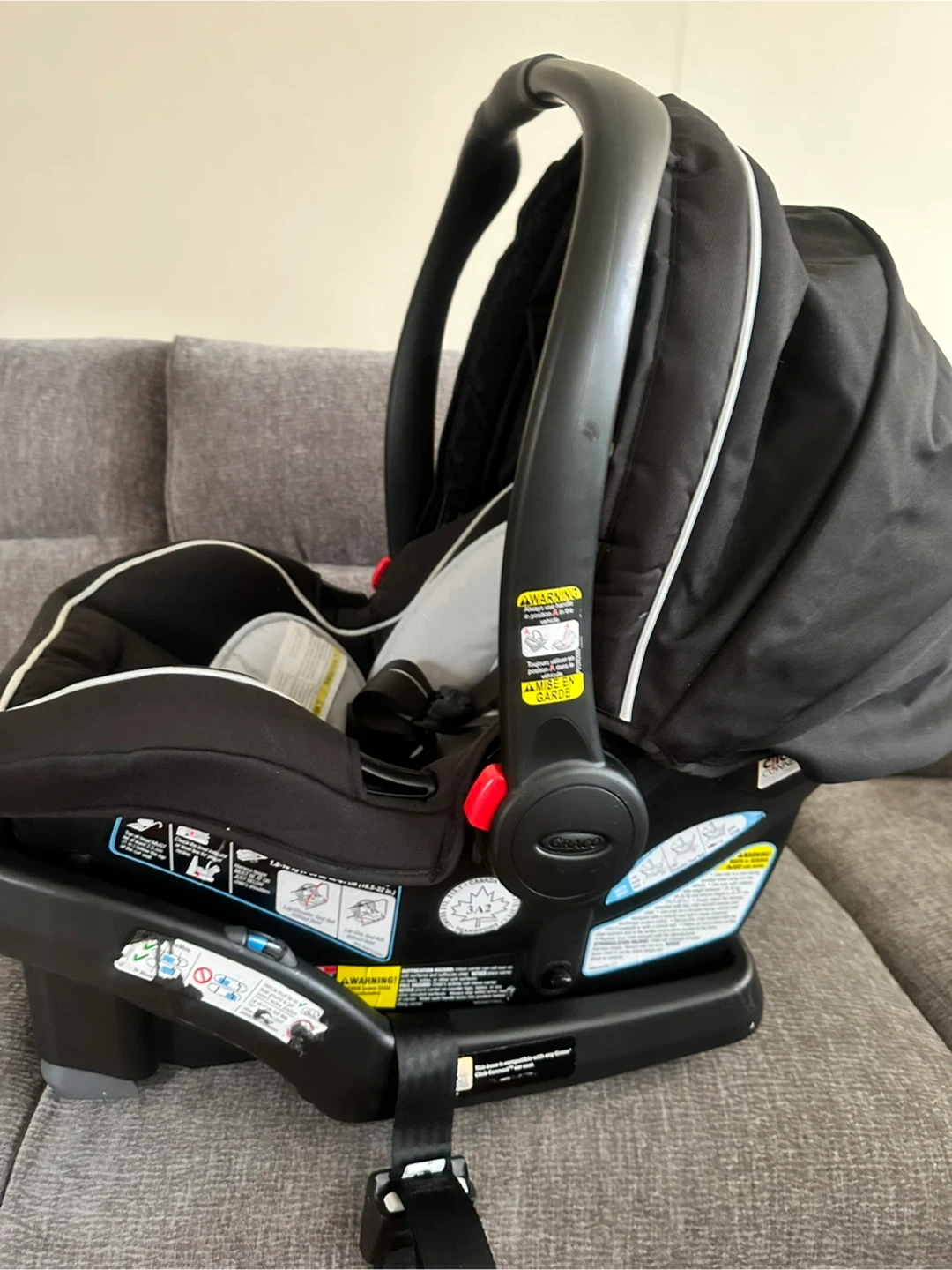 Black infant car seat and base. This car seat is designed for babies and includes a harness for safety. It's a Graco SnugRide 35 model. It's suitable for infants up to 35 pounds.