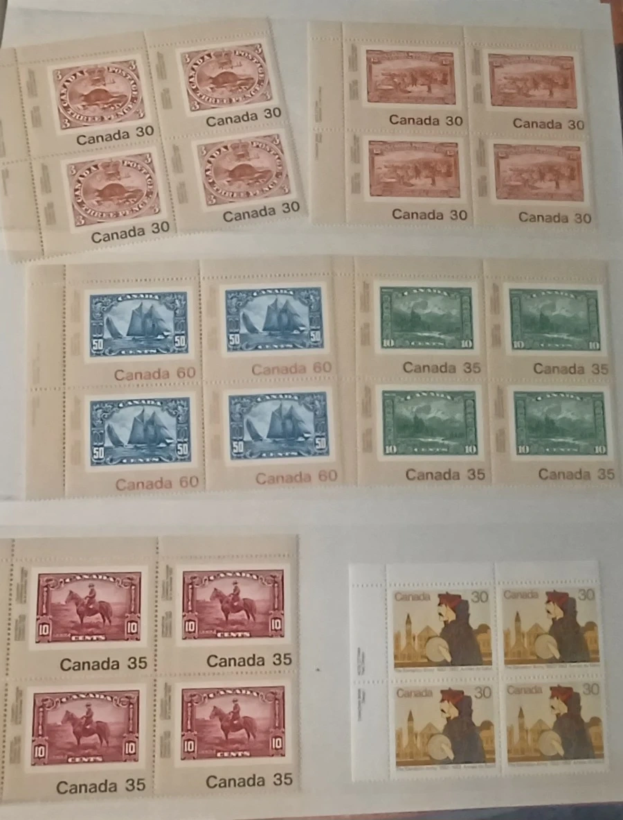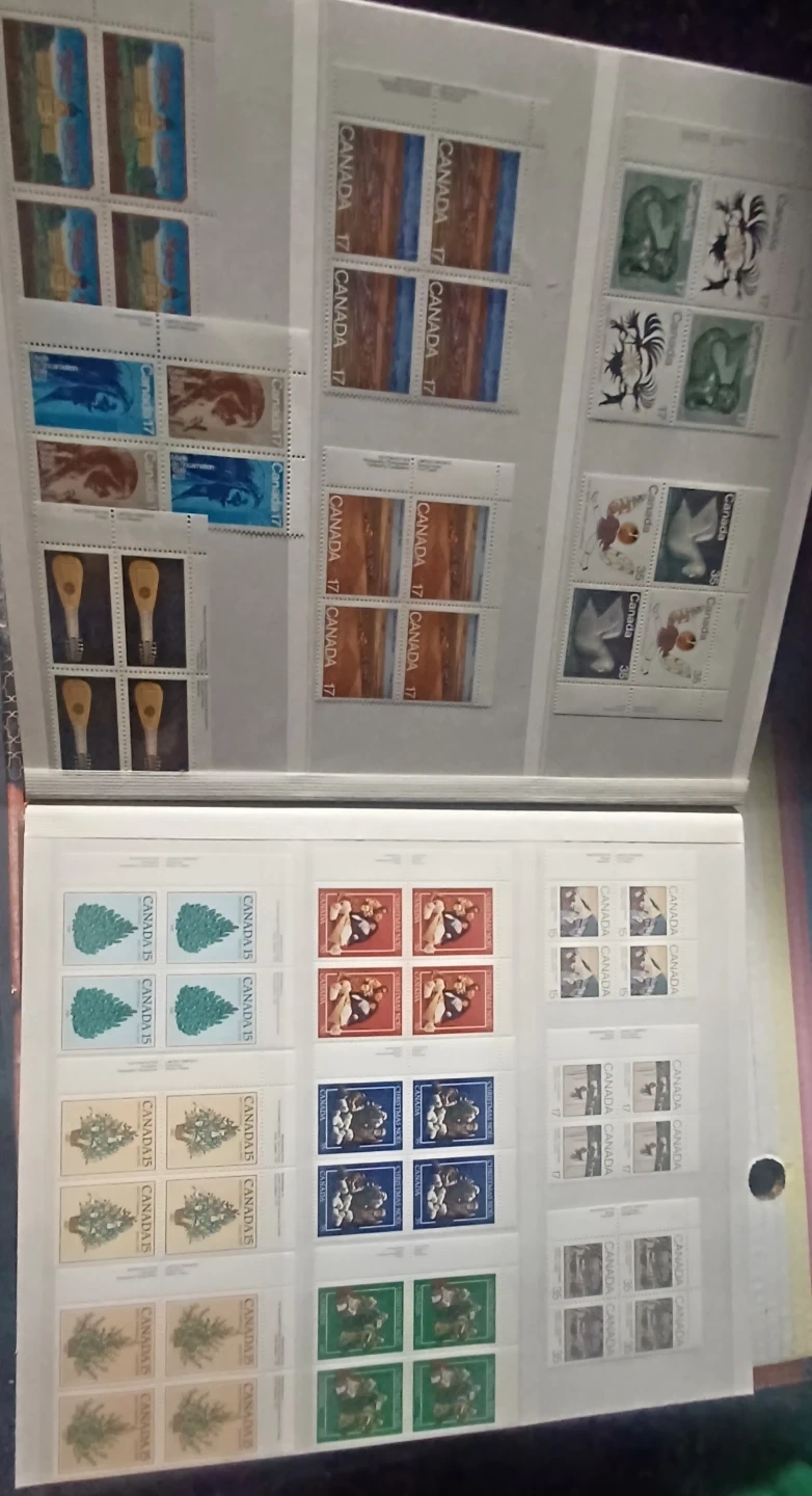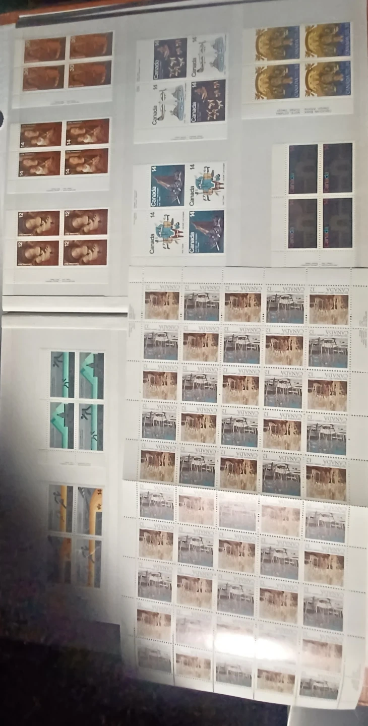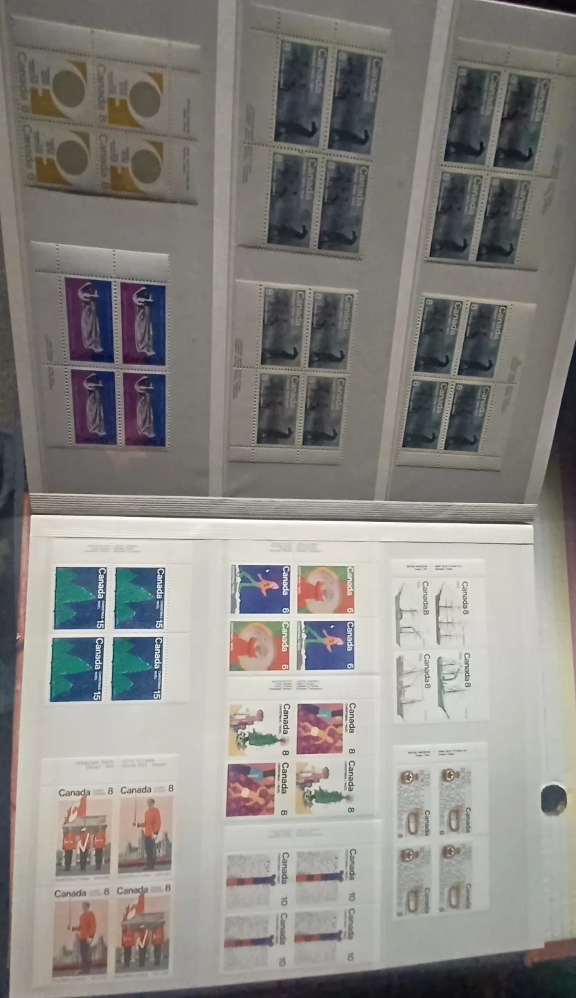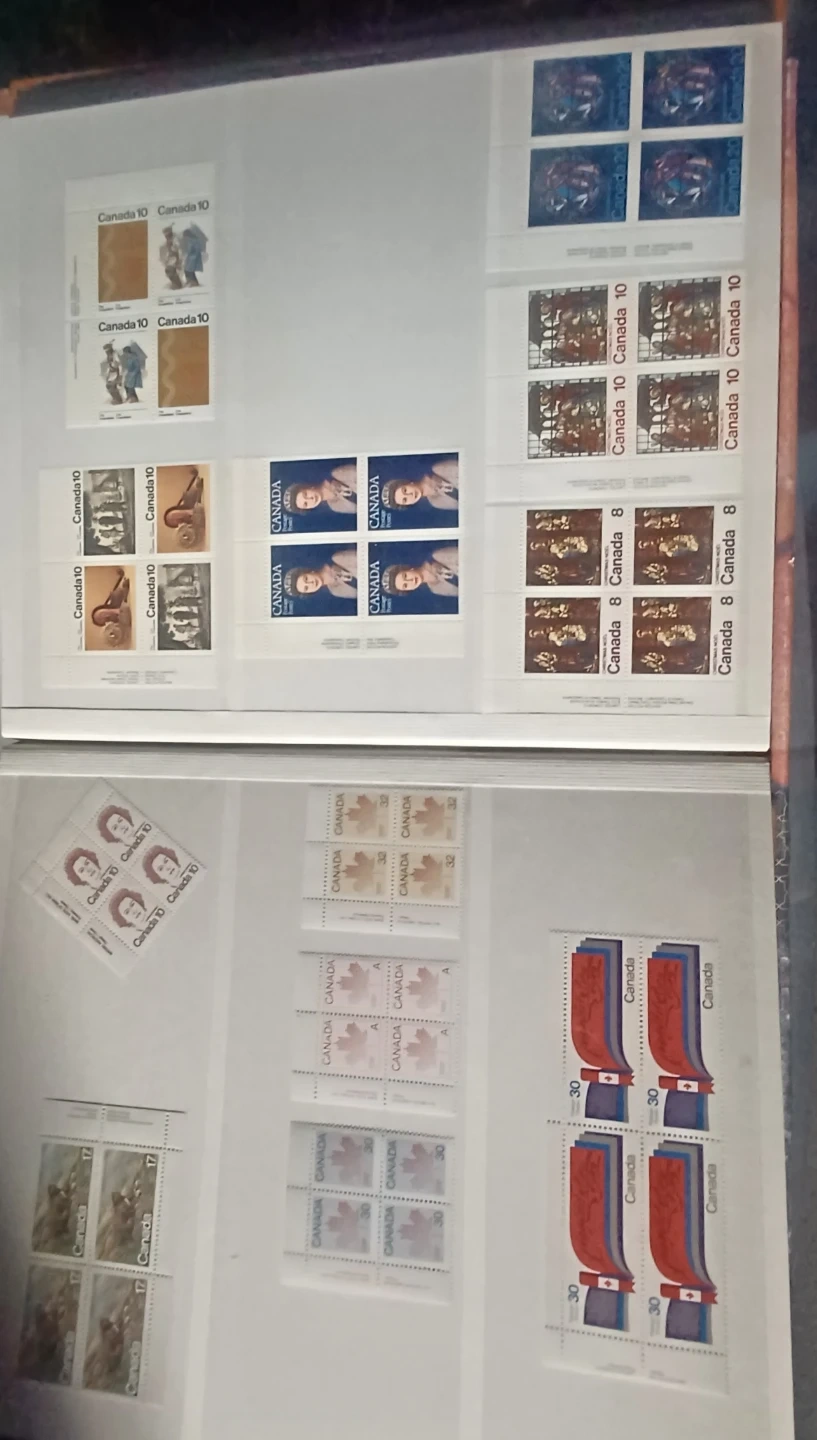 Various Canadian stamps from different years and denominations are included. These stamps depict diverse Canadian themes and historical figures. A great addition for any stamp collector! 32 pages, roughly $220.00 in face value, not used, mostly blocks, many 1976 Olympic blocks, $0.01 to $5 stamps, open to offers, 900+ stamps.
