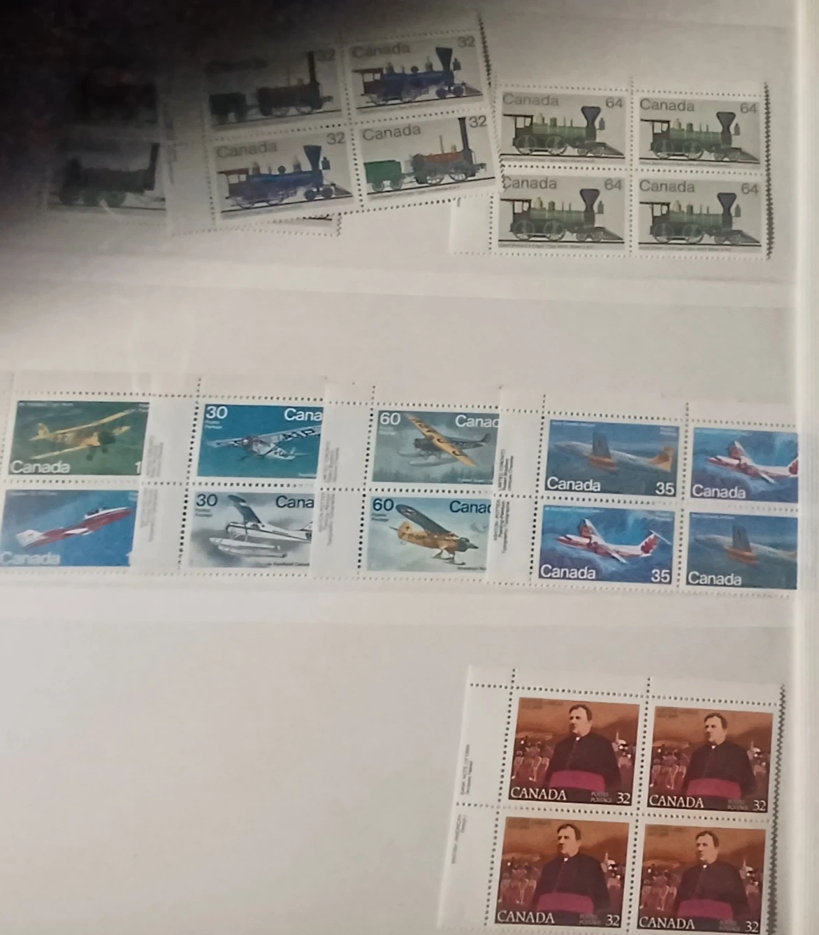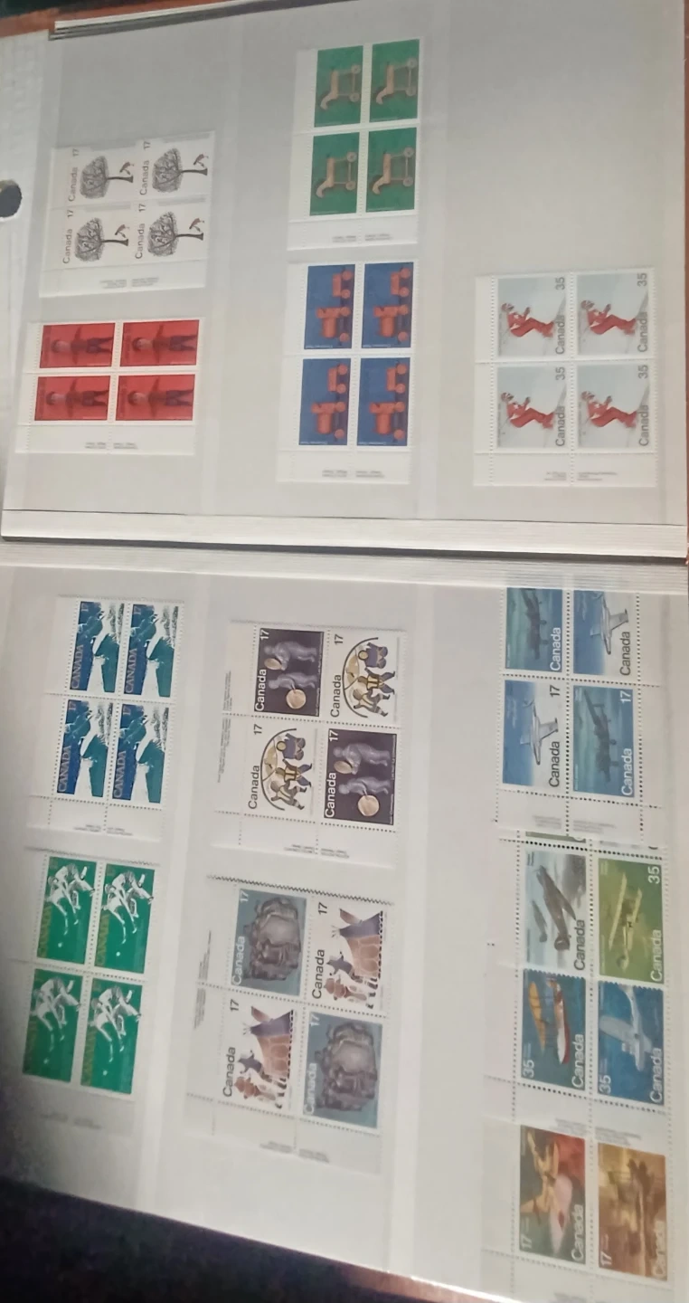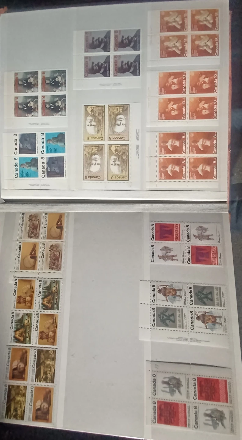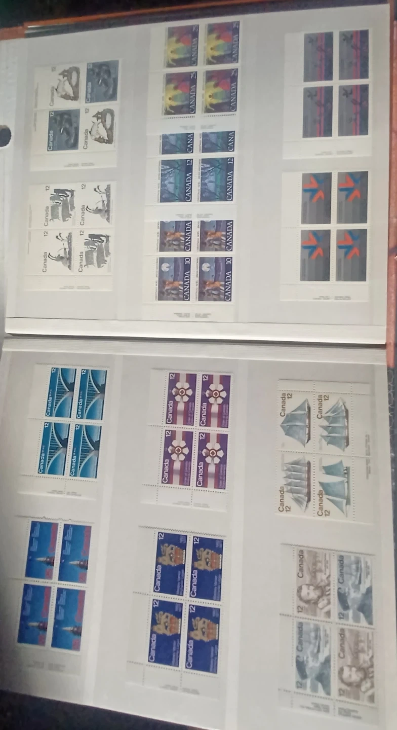 Various Canadian stamps from different years and denominations are included. These stamps depict diverse Canadian themes and historical figures. A great addition for any stamp collector! 32 pages, roughly $220.00 in face value, not used, mostly blocks, many 1976 Olympic blocks, $0.01 to $5 stamps, open to offers, 900+ stamps.