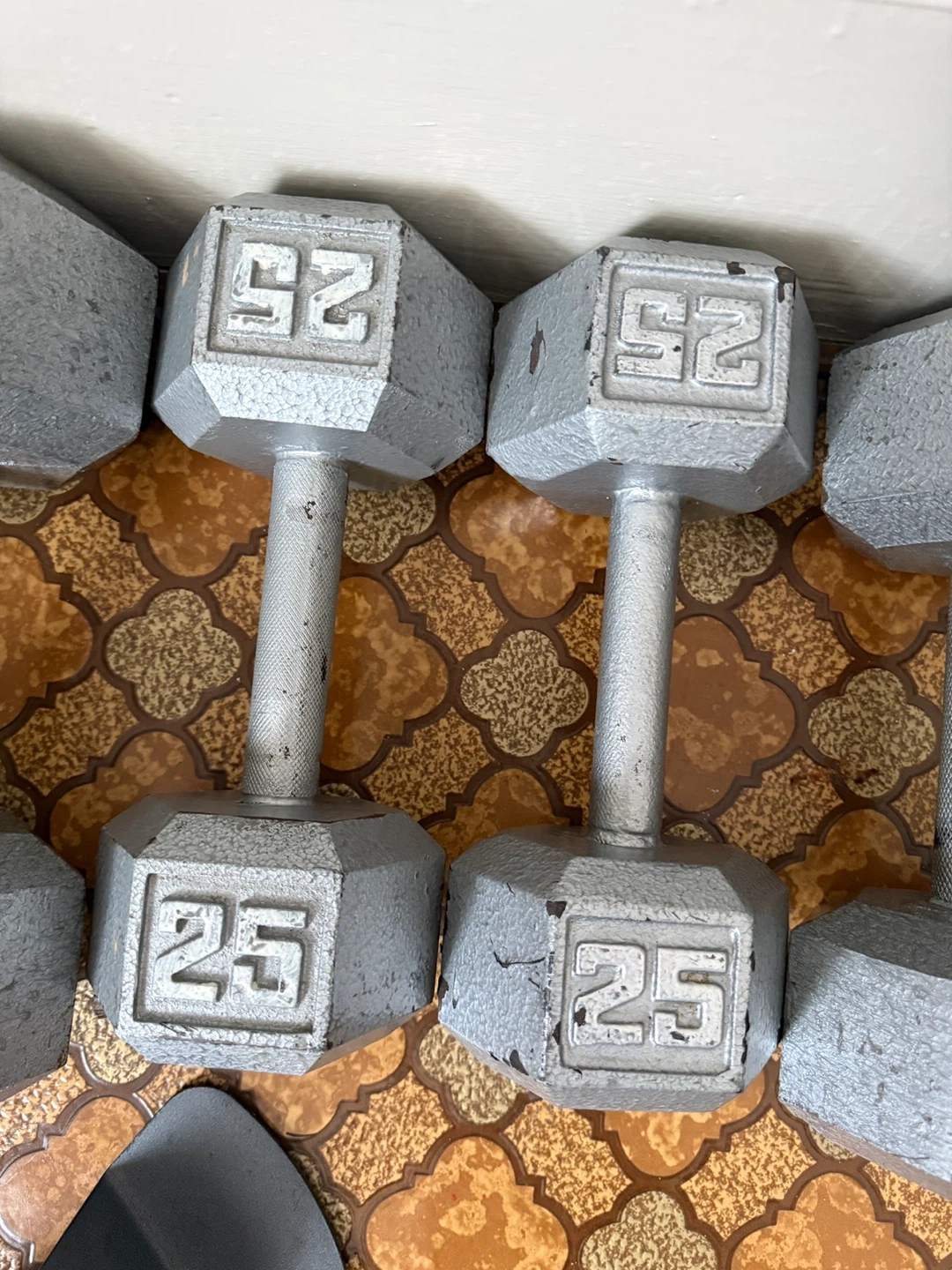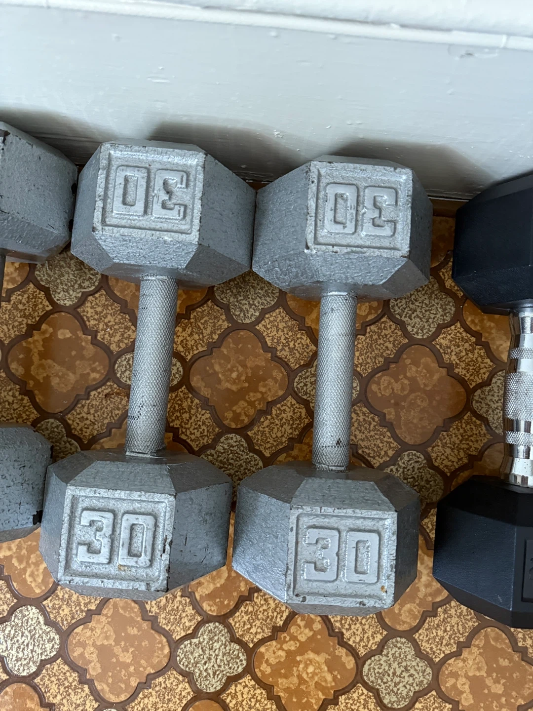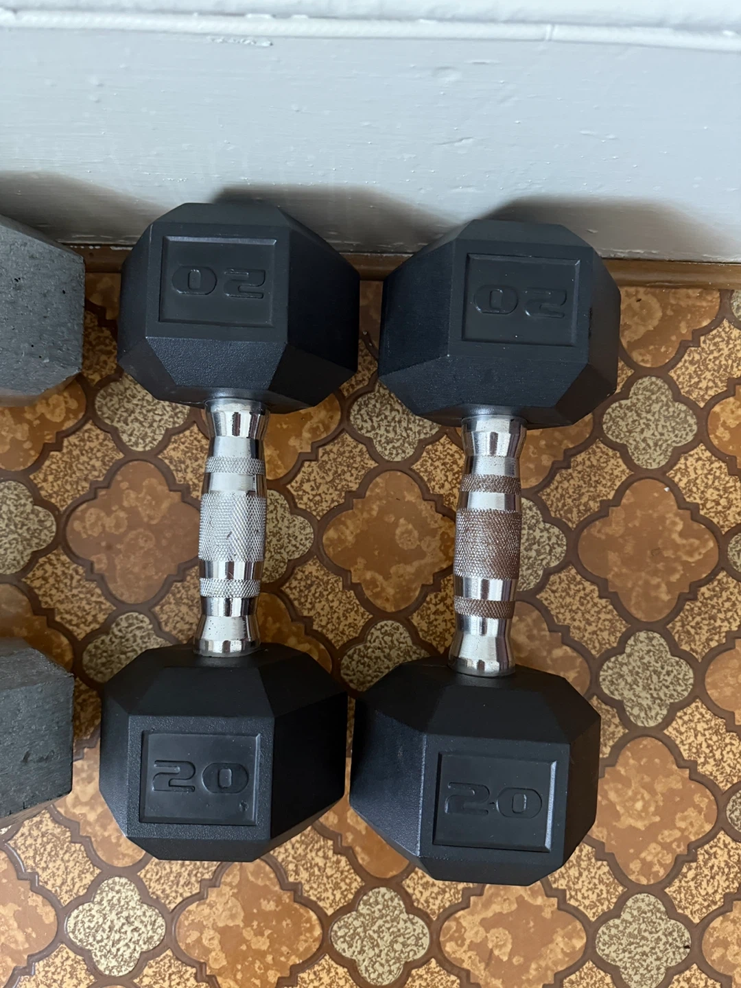 A collection of hex dumbbells for your home gym. Includes pairs of 20lb, 25lb, 30lb, and 40lb weights. These are great for strength training and cardio workouts!