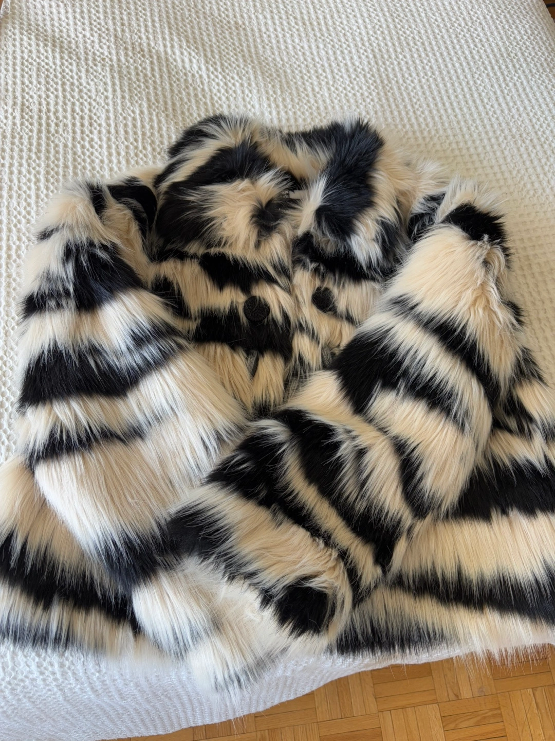 Black and cream zebra-striped faux fur jacket. Features a sequined eye patch. Size XL. Made in China.