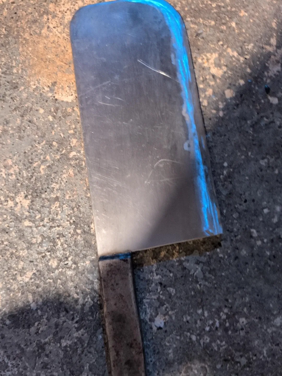 This is a large, heavy-duty metal cleaver. It's made of stainless steel and has a sturdy handle. This cleaver is suitable for chopping tough ingredients.