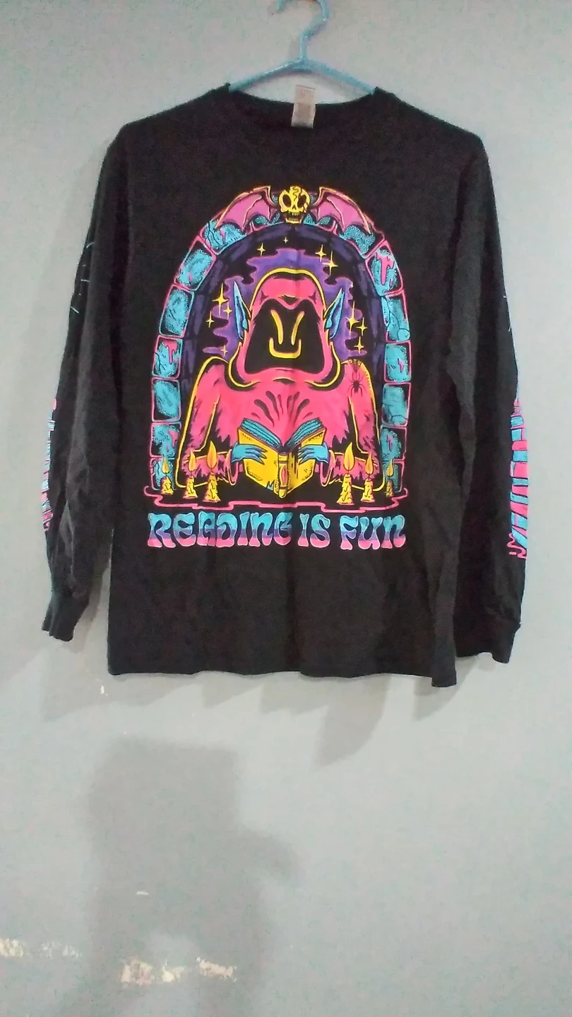 Black long-sleeve t-shirt with a vibrant graphic that says "Reading is Fun". Features a hooded figure reading a book surrounded by candles and gothic architectural elements. Sleeves have a decorative band with similar colours. Cotton material.