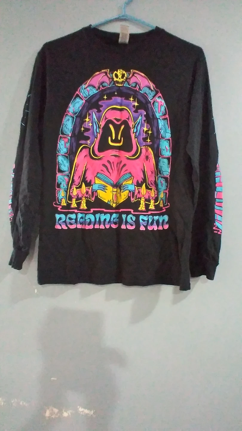 Black long-sleeve t-shirt with a vibrant graphic that says "Reading is Fun". Features a hooded figure reading a book surrounded by candles and gothic architectural elements. Sleeves have a decorative band with similar colours. Cotton material.