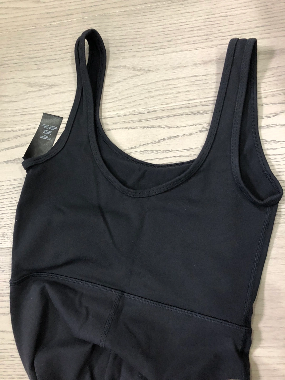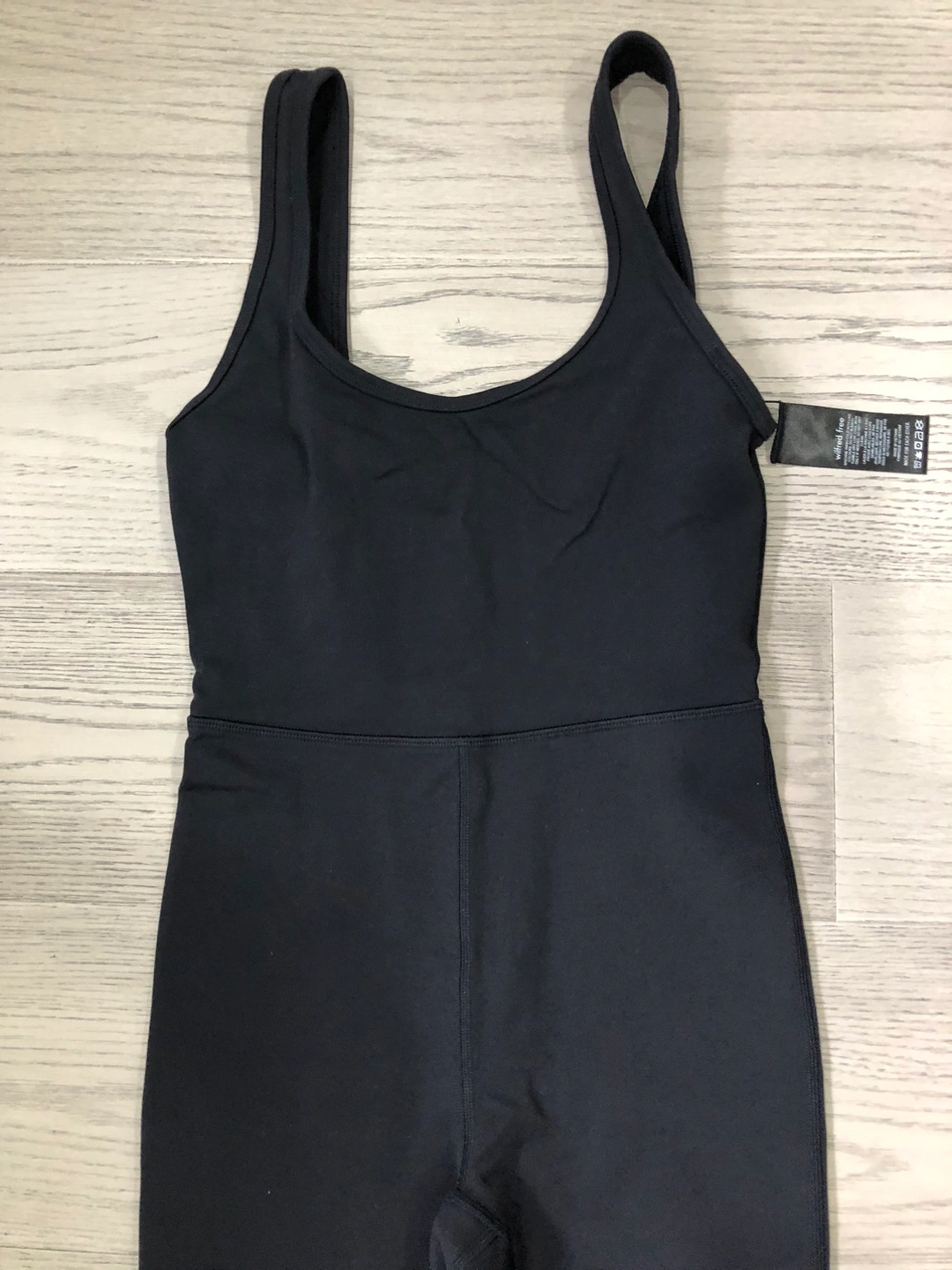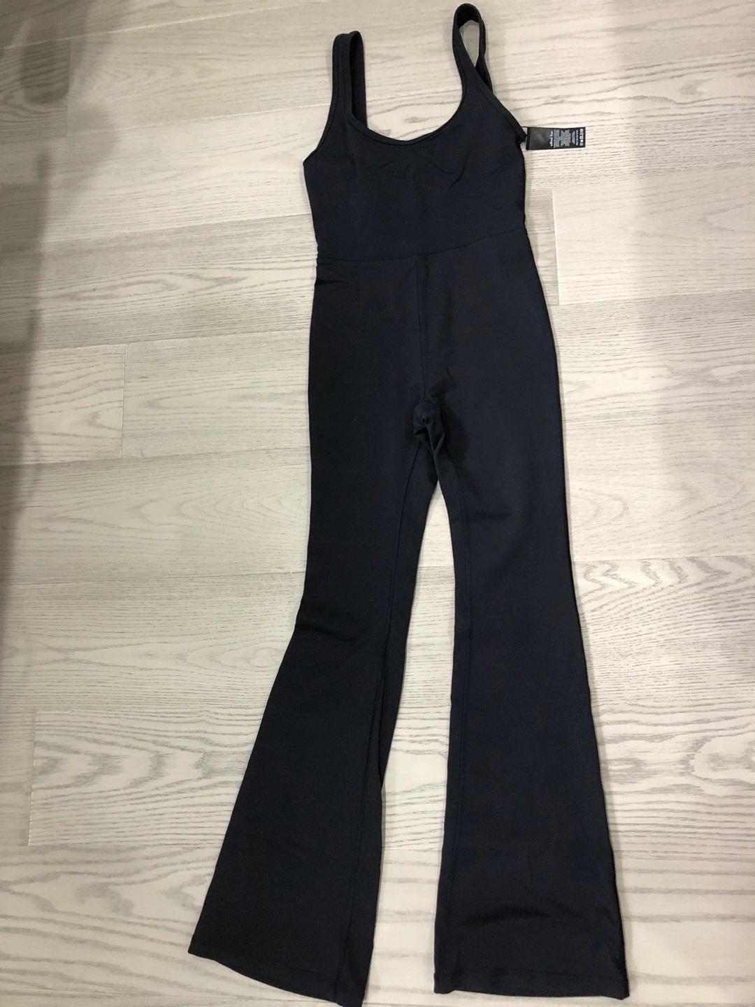 A black jumpsuit. Featuring tank straps. Has a fitted bodice. Wide flared pants. This piece would be perfect for a gentle yoga session, creating a space for relaxation.