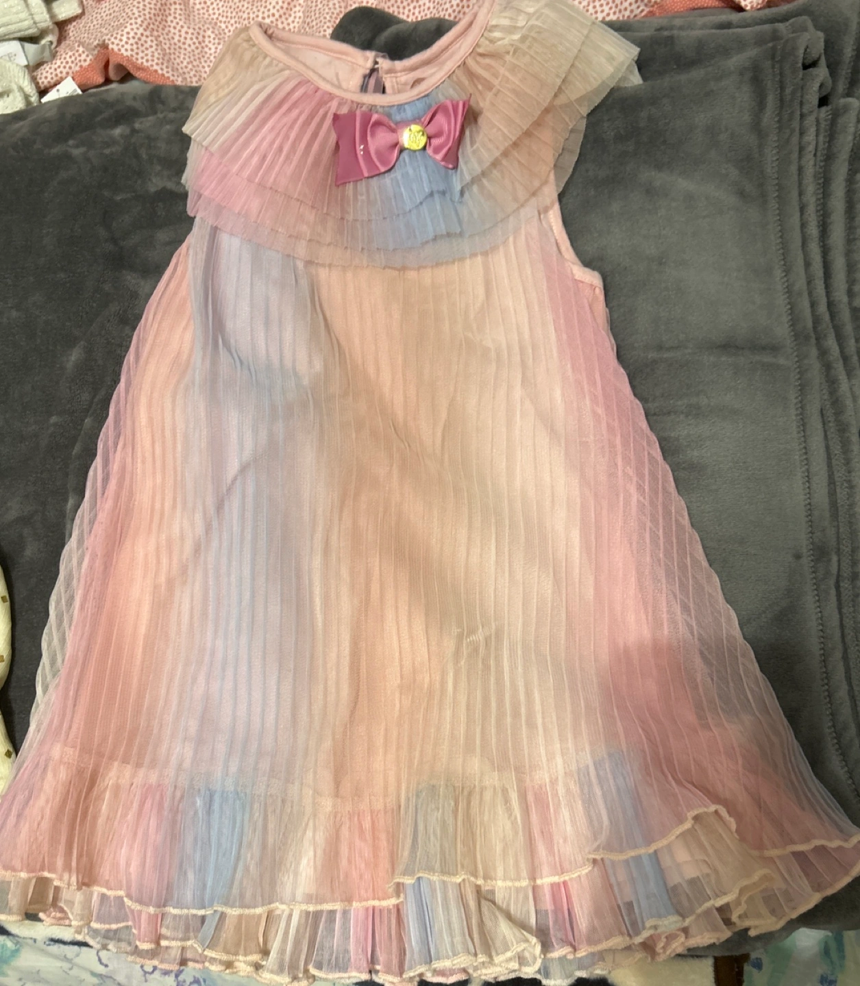 Sleeveless dress with a pink bow and layered ruffles. Pink, blue, and white colours. Size 5-6