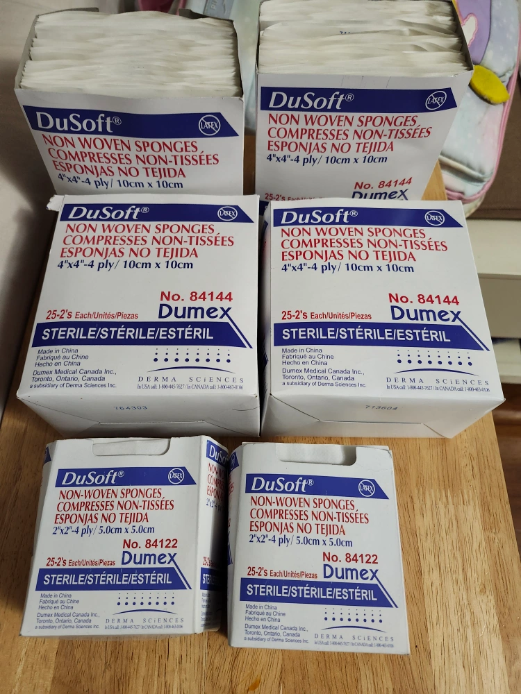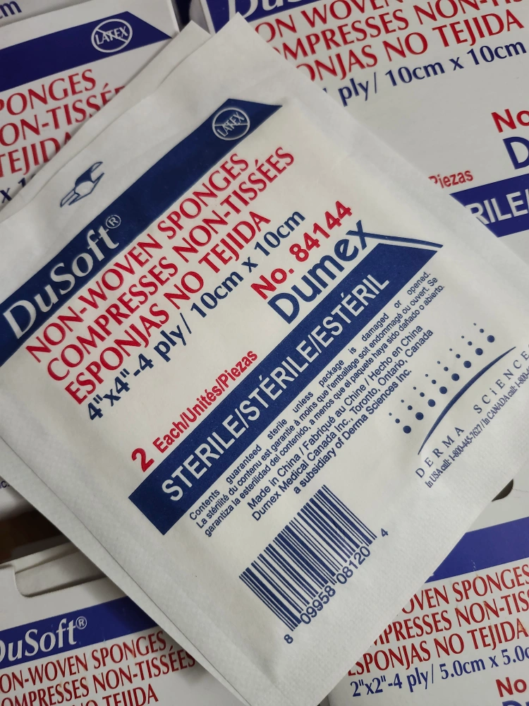 Package of DuSoft non-woven sterile sponges. Various sizes available: 4"x4" and 2"x2". Sterile and individually packaged. ideal for medical or first-aid use.