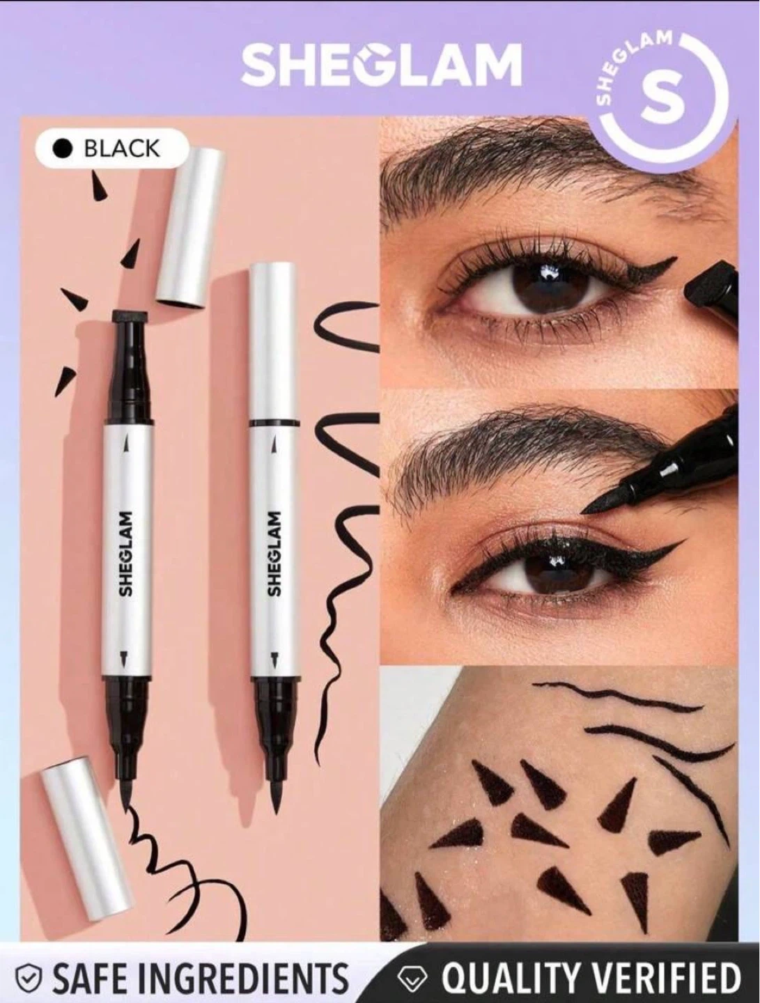 Brand new Sheglam eyeliner. Features a 2-in-1 design with a stamp and liner. Water-resistant and alcohol-free formula. Melts off with warm water. Black colour.