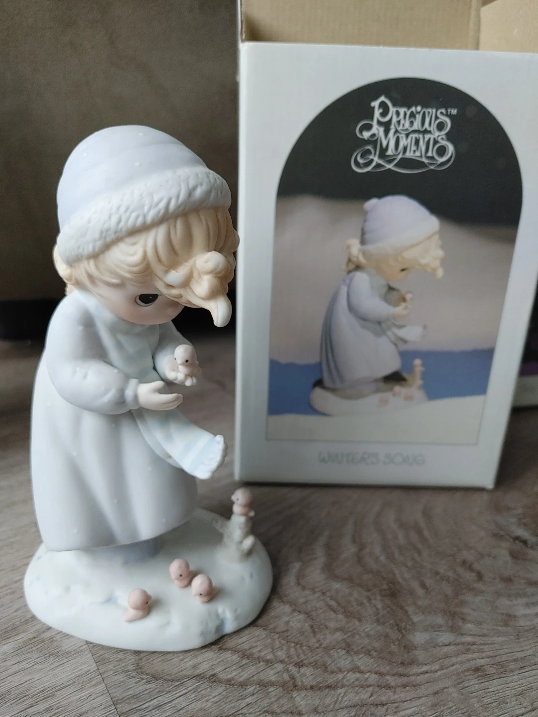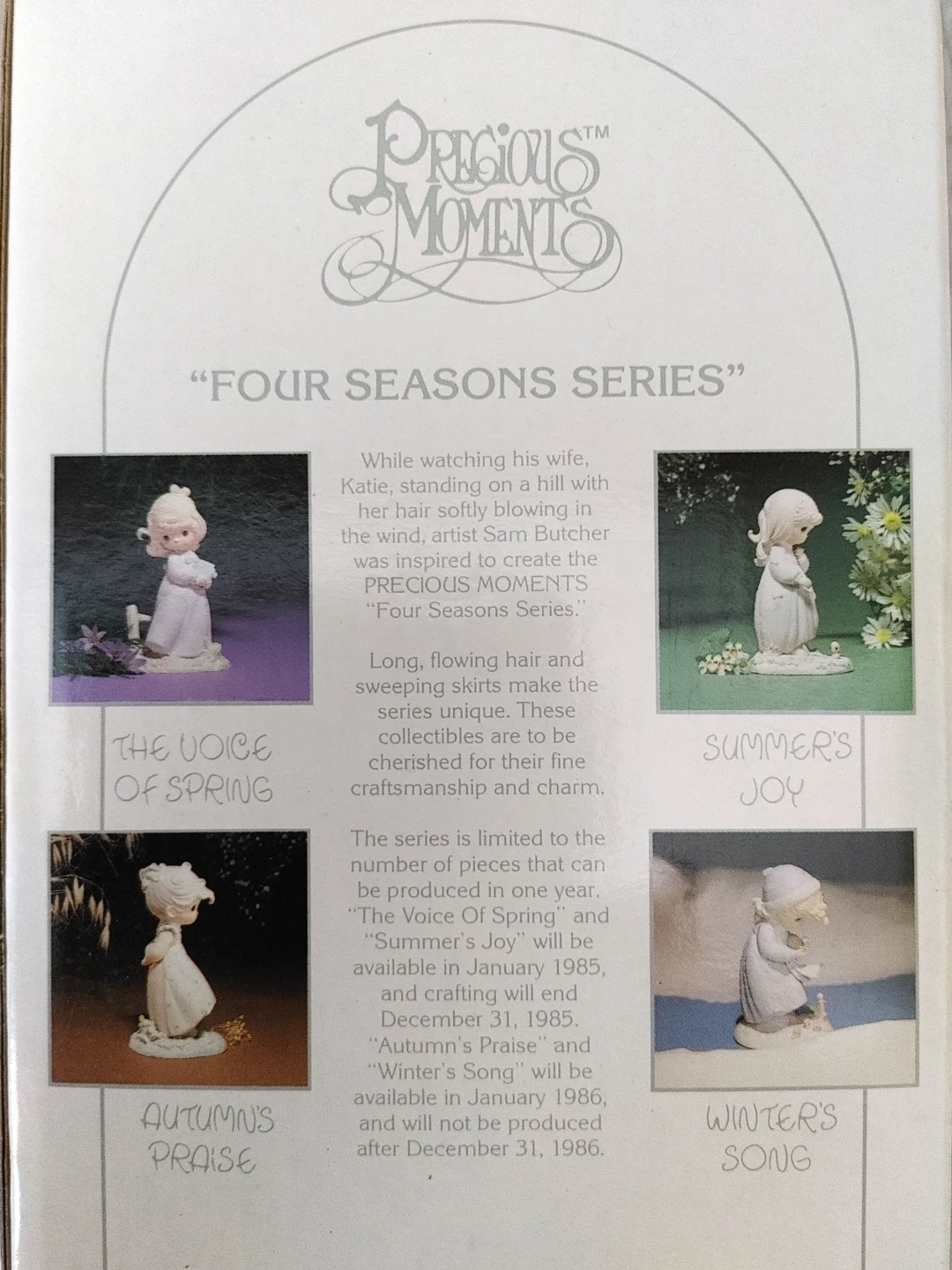 Four Precious Moments figurines, each representing a season: Autumn's Praise, Summer's Joy, Winter's Song, and The Voice of Spring. These collectible porcelain pieces come with their original boxes. They're delightful for collectors or as a charming display.