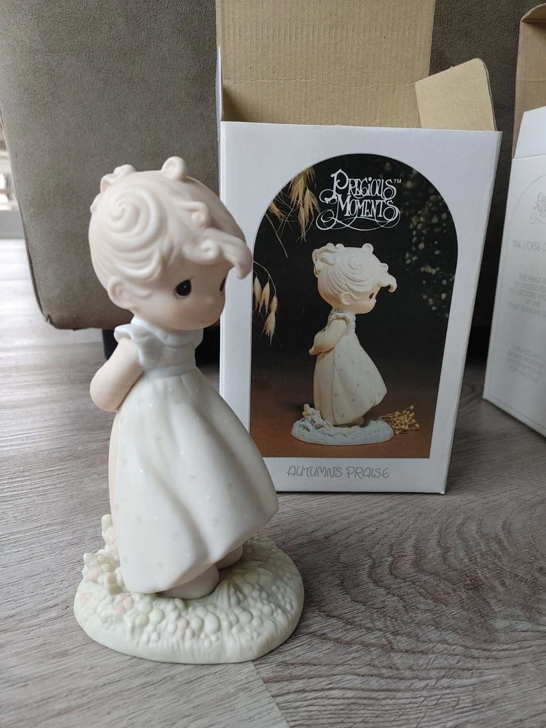 Four Precious Moments figurines, each representing a season: Autumn's Praise, Summer's Joy, Winter's Song, and The Voice of Spring. These collectible porcelain pieces come with their original boxes. They're delightful for collectors or as a charming display.