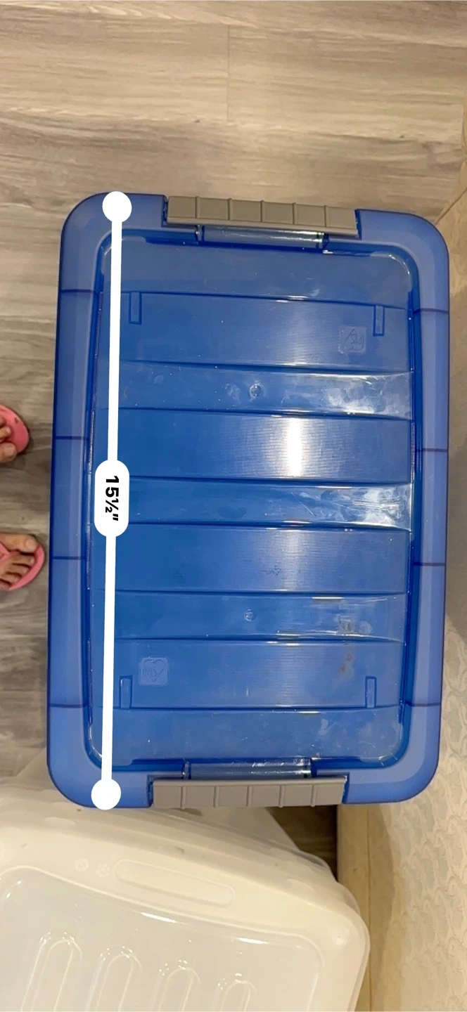 Set of 5 clear plastic storage bins with blue lids. Each bin measures 15 1/2 inches long and 5 1/2 inches high. They're stackable for convenient storage. These bins are great for organizing various items around the home.