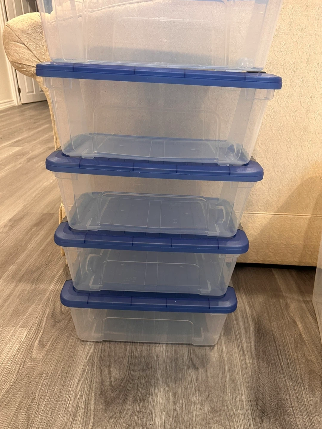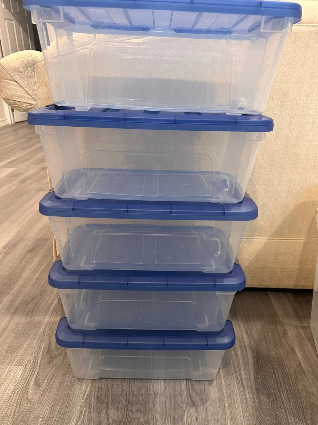 Set of 5 Clear Storage Bins with Blue Lids