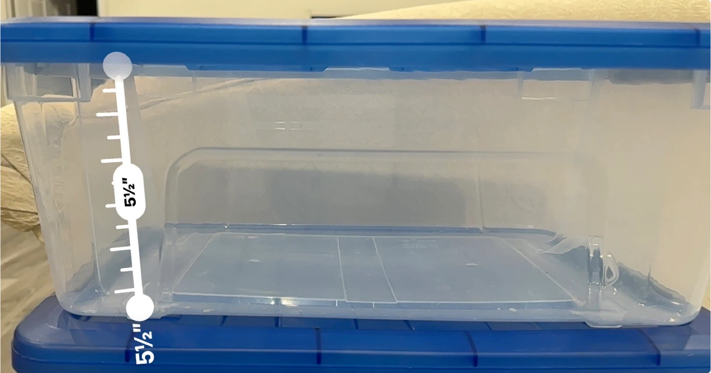 Set of 5 clear plastic storage bins with blue lids. Each bin measures 15 1/2 inches long and 5 1/2 inches high. They're stackable for convenient storage. These bins are great for organizing various items around the home.