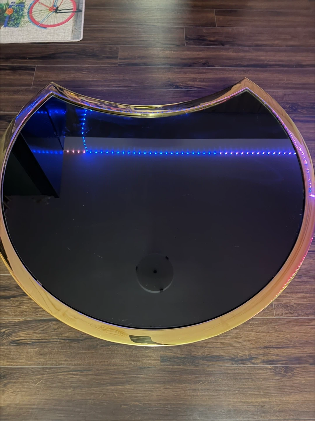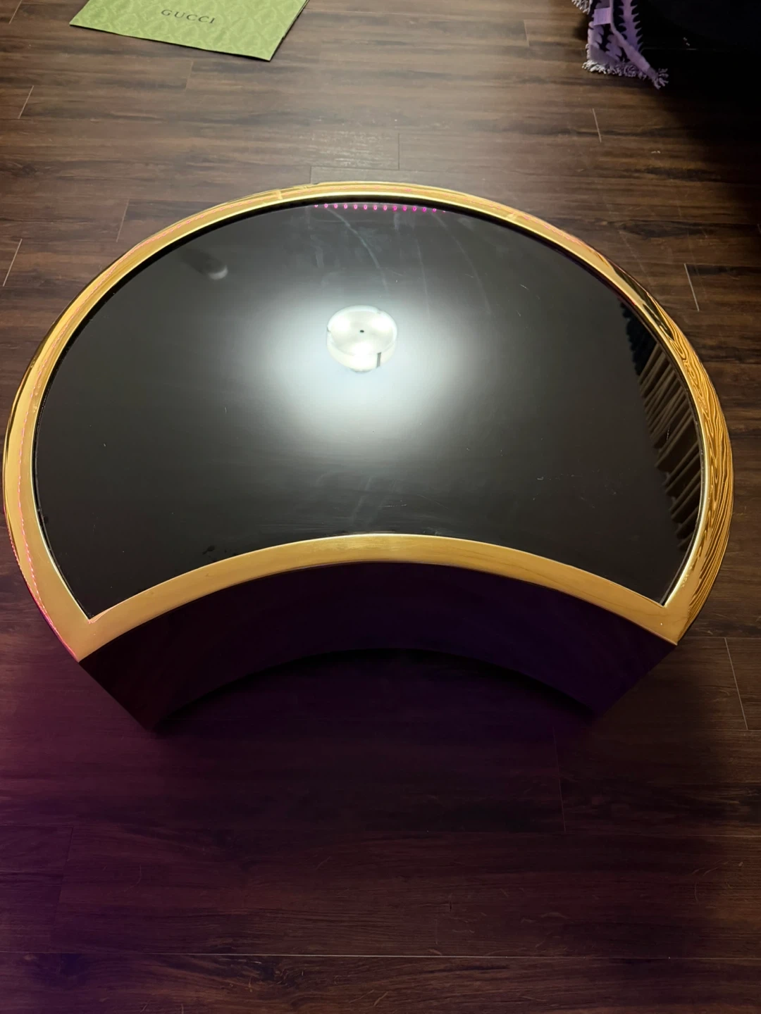 Modern Crescent Coffee Table with Black Glass Top and Gold Trim