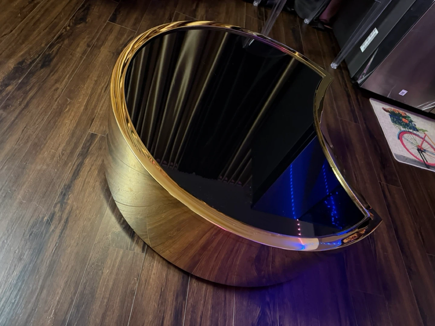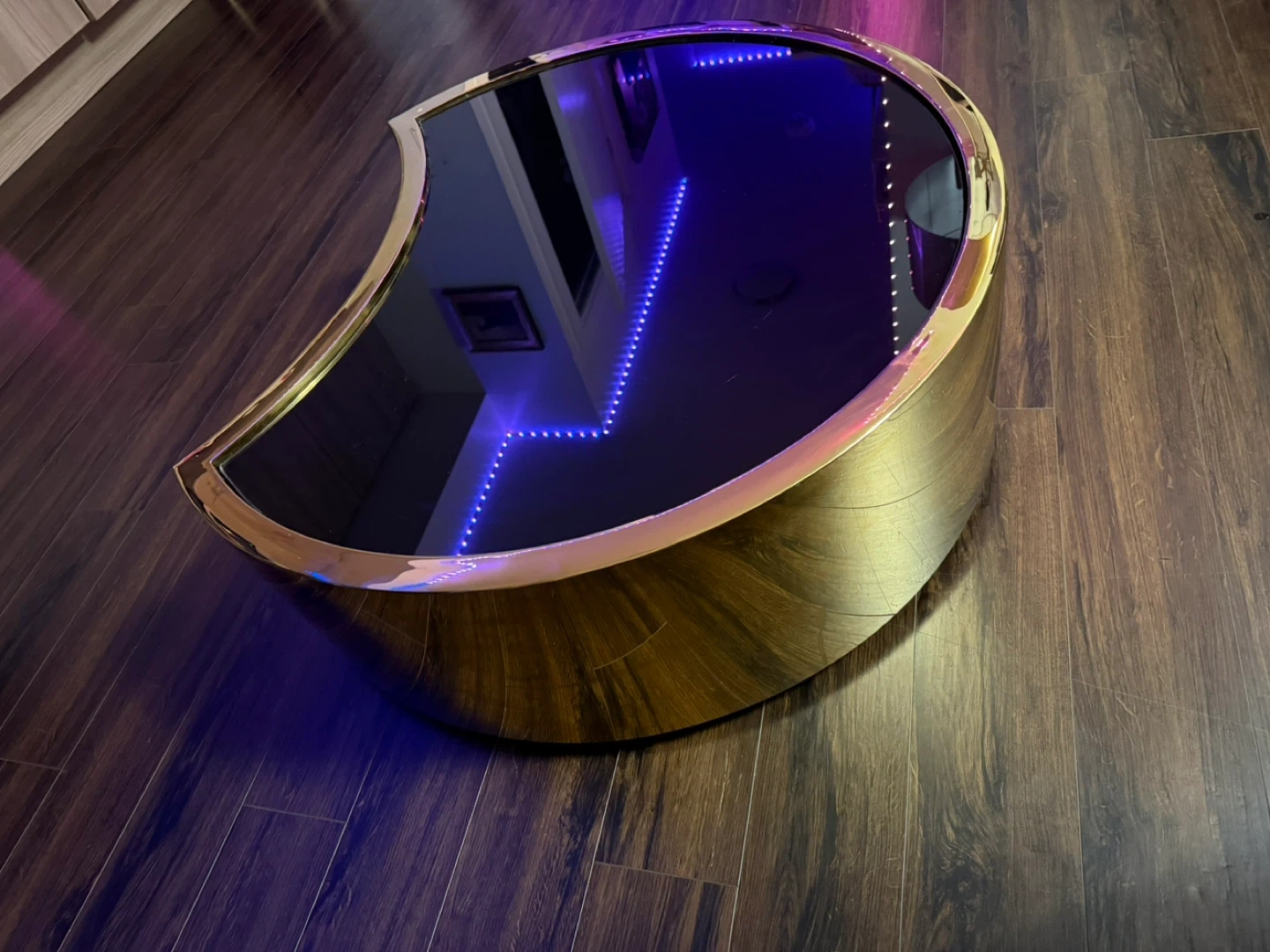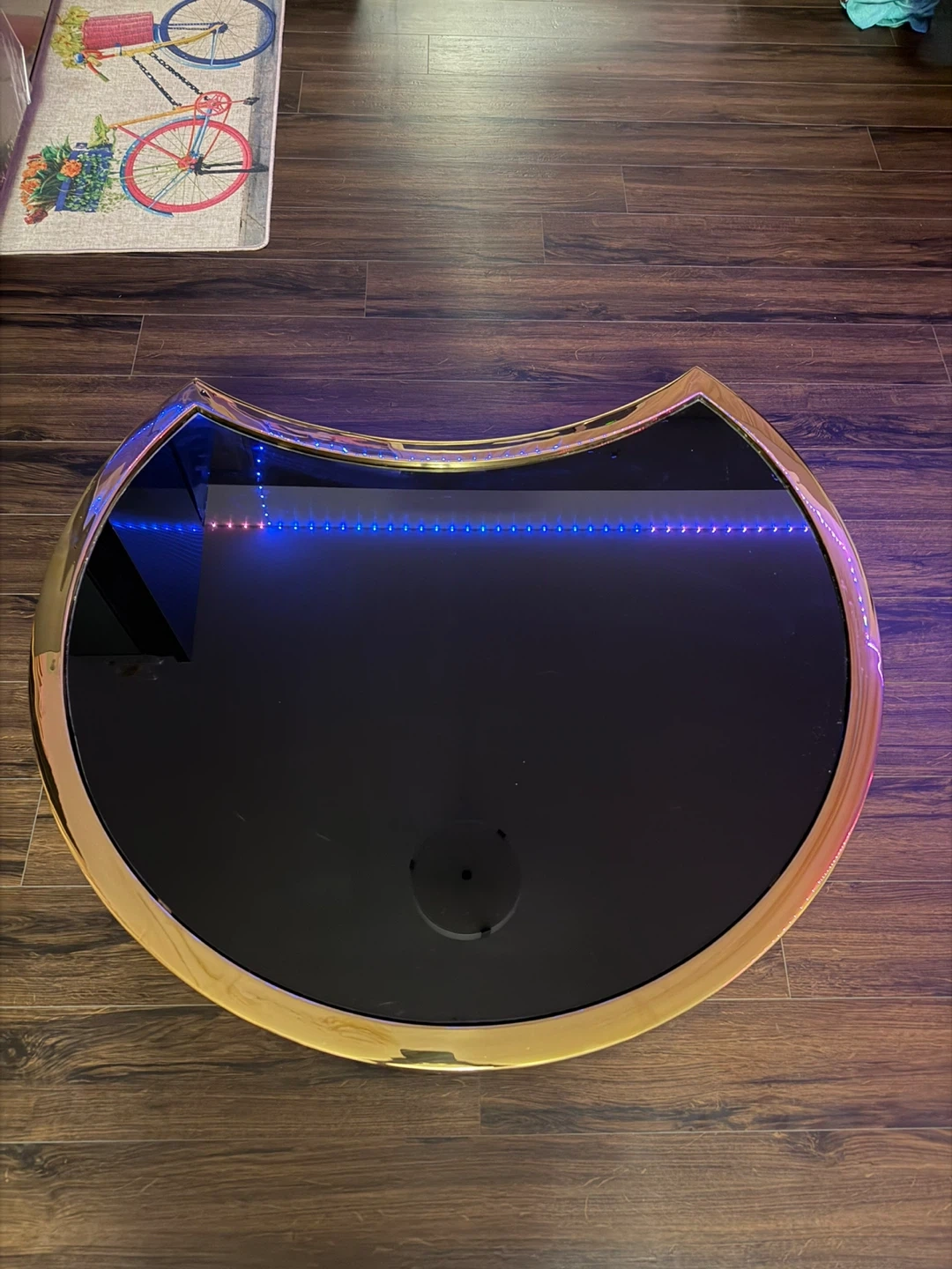 Modern Crescent Coffee Table with Black Glass Top and Gold Trim