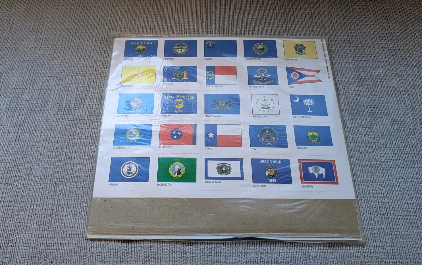This poster sheet features the flags of all 50 United States. It's indicated for use in home, albums, school projects, or hobbies. A great educational tool for learning about the states!