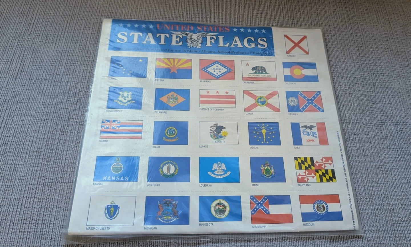 This poster sheet features the flags of all 50 United States. It's indicated for use in home, albums, school projects, or hobbies. A great educational tool for learning about the states!