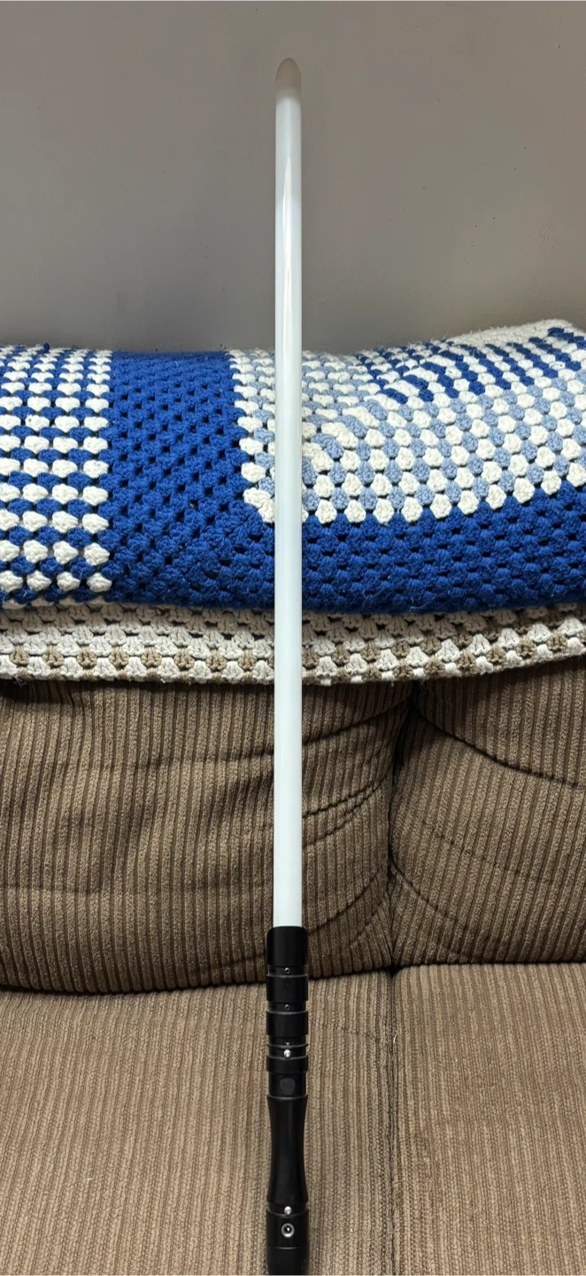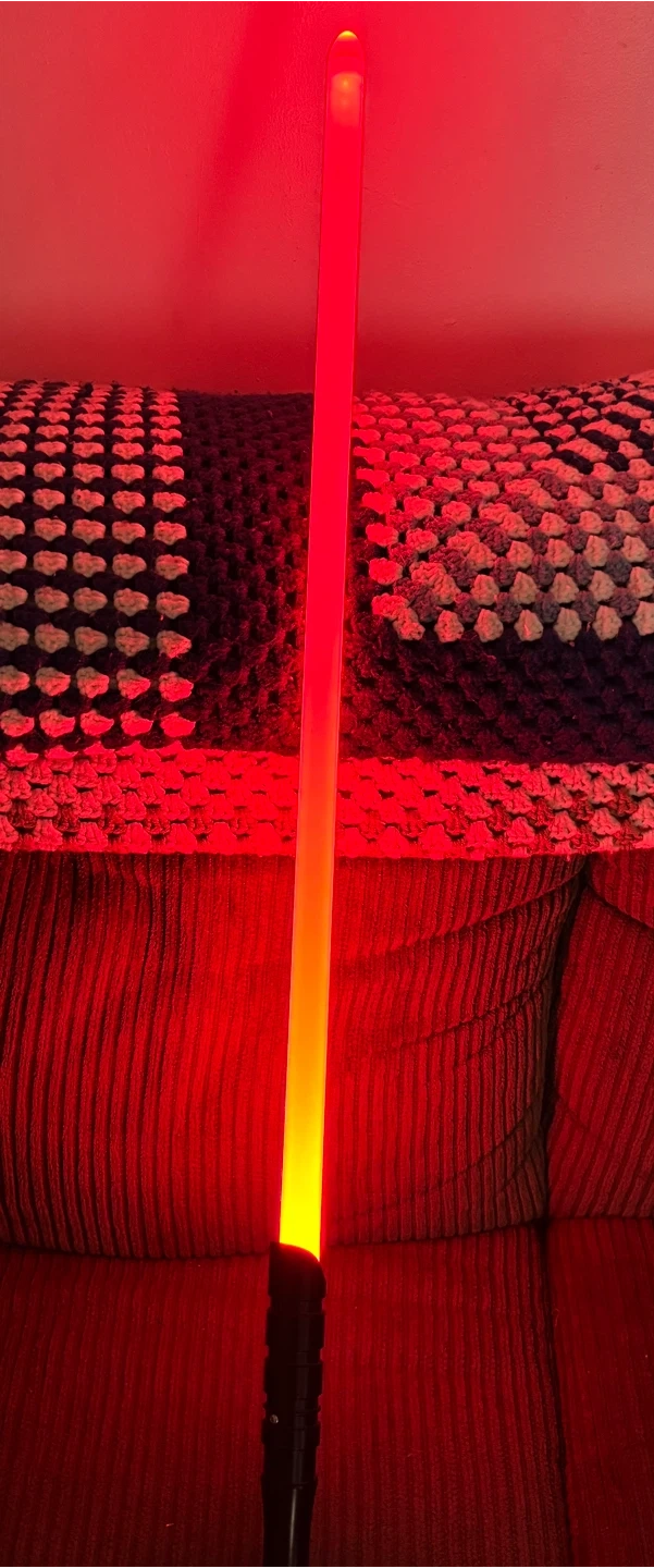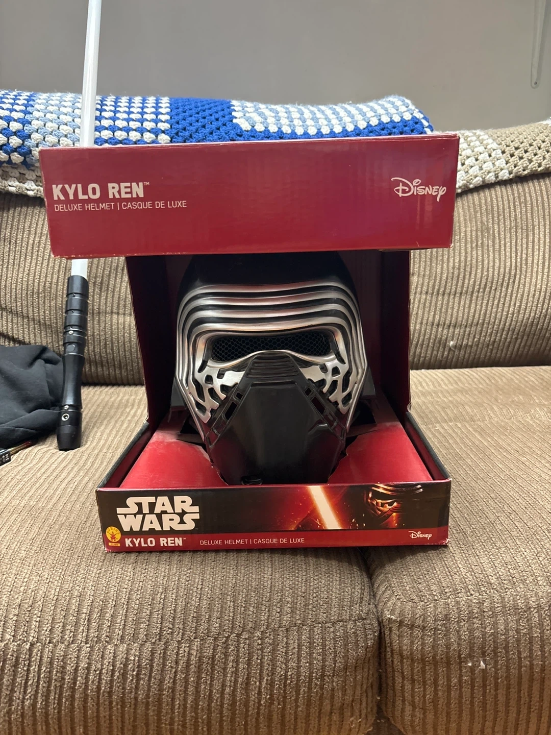 This is a Kylo Ren deluxe helmet from Star Wars, designed in two pieces. It's suitable for ages 14 and up. Comes with the original box. Also comes with a light saber.