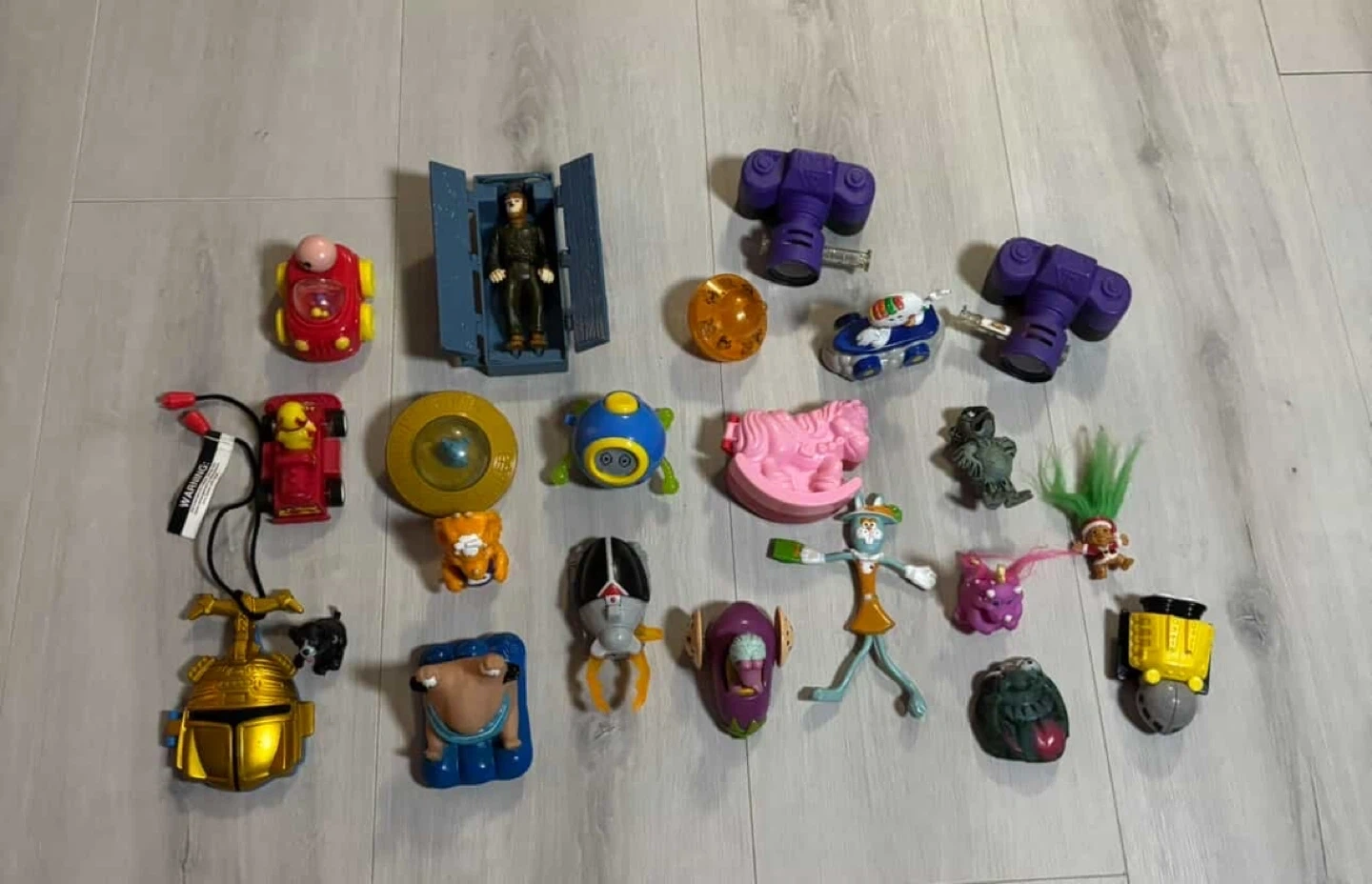 A wild mix of colorful characters, vehicles, monsters, and mystery toys from across the 90s and early 2000s — including what looks like some McDonald’s and Burger King premiums. Over 20+ items
