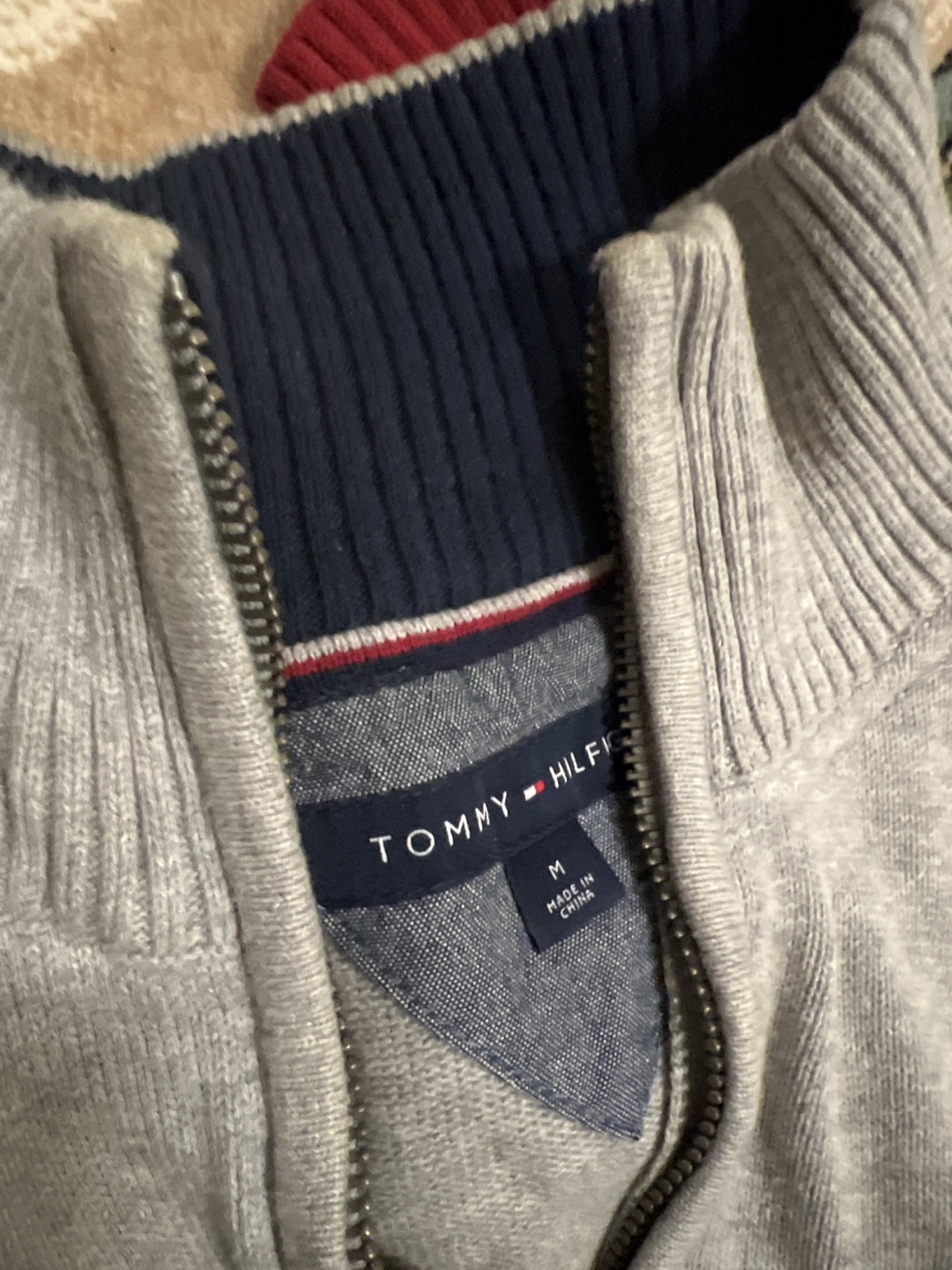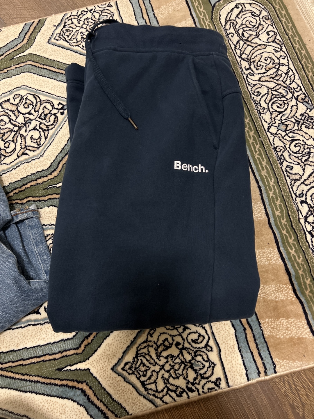 Bundle includes a pair of light wash jeans ,a grey and navy striped Tommy Hilfiger sweater, navy Bench joggers, and a black collared shirt.