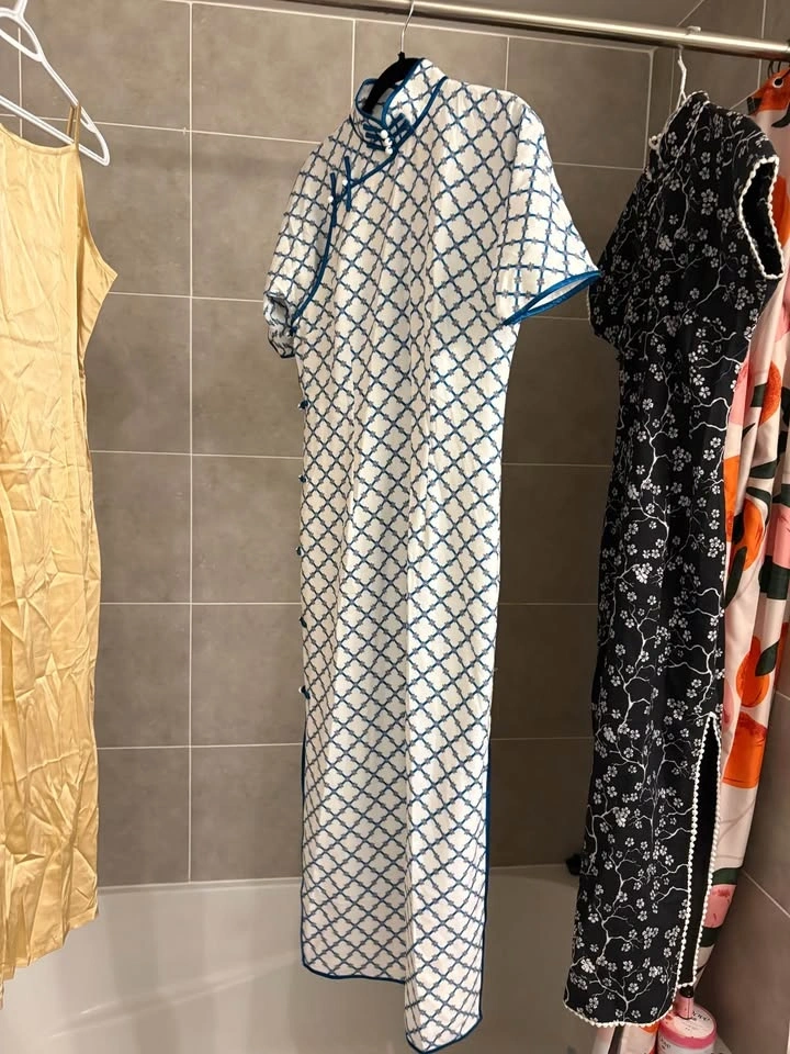 Traditional cut Qipao (cheongsam) bought in China, size M (Chinese size L), 130cm length. Unique MeiHua (plum blossom) pattern, the form is similar to the one in image 4. Original price was more than $200, only wore twice. Check my page for the other white one; if you buy both, I’ll give you the silk slip dress for free.