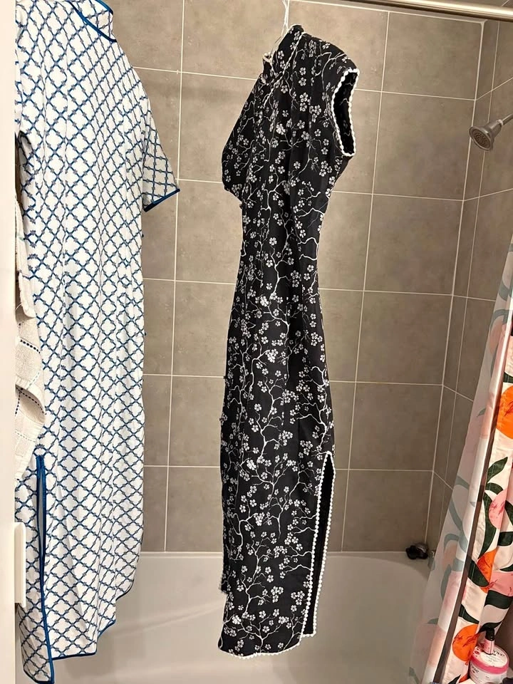 Traditional cut Qipao (cheongsam) bought in China, size M (Chinese size L), 130cm length. Unique MeiHua (plum blossom) pattern, the form is similar to the one in image 4. Original price was more than $200, only wore twice. Check my page for the other white one; if you buy both, I’ll give you the silk slip dress for free.
