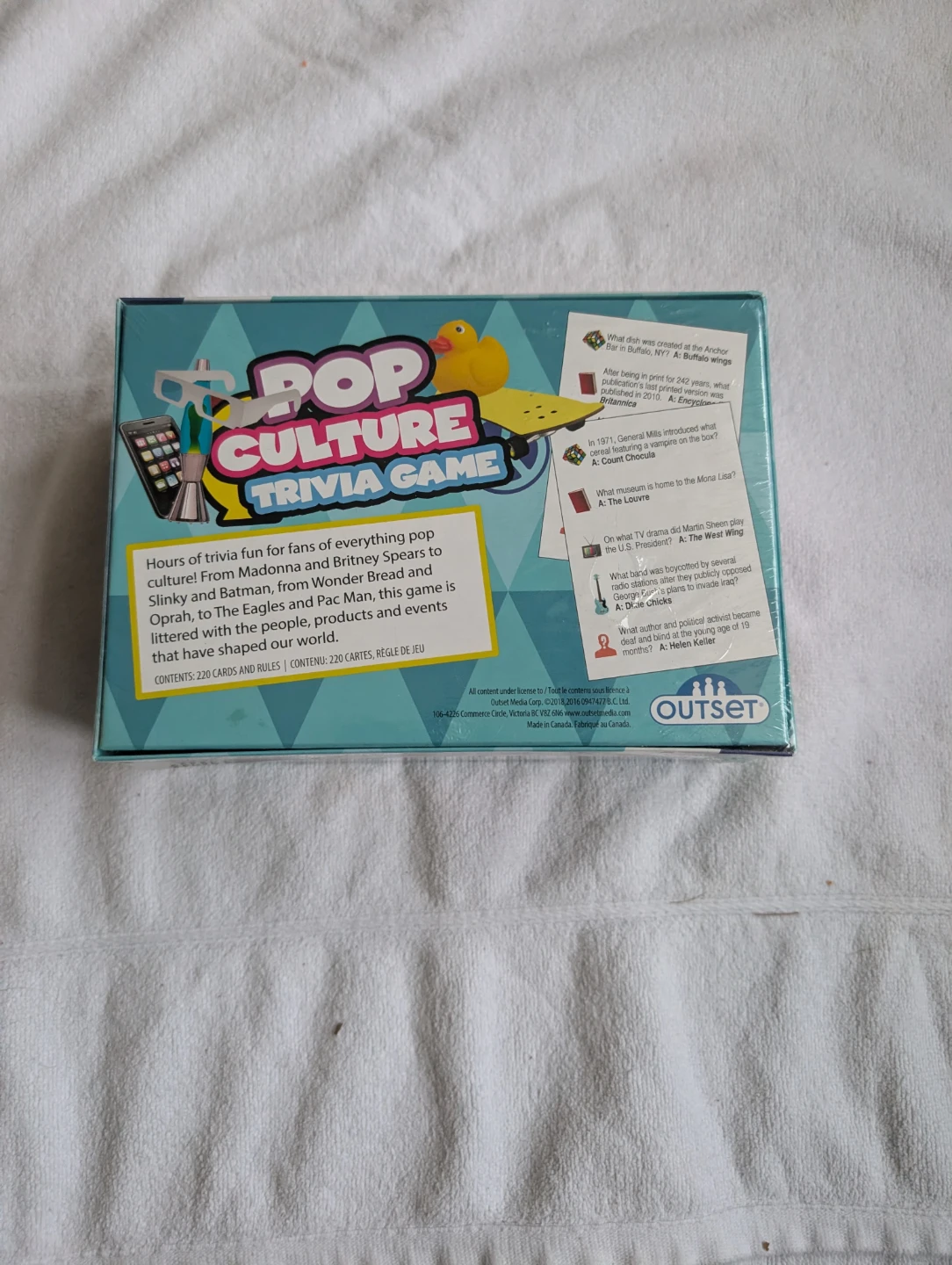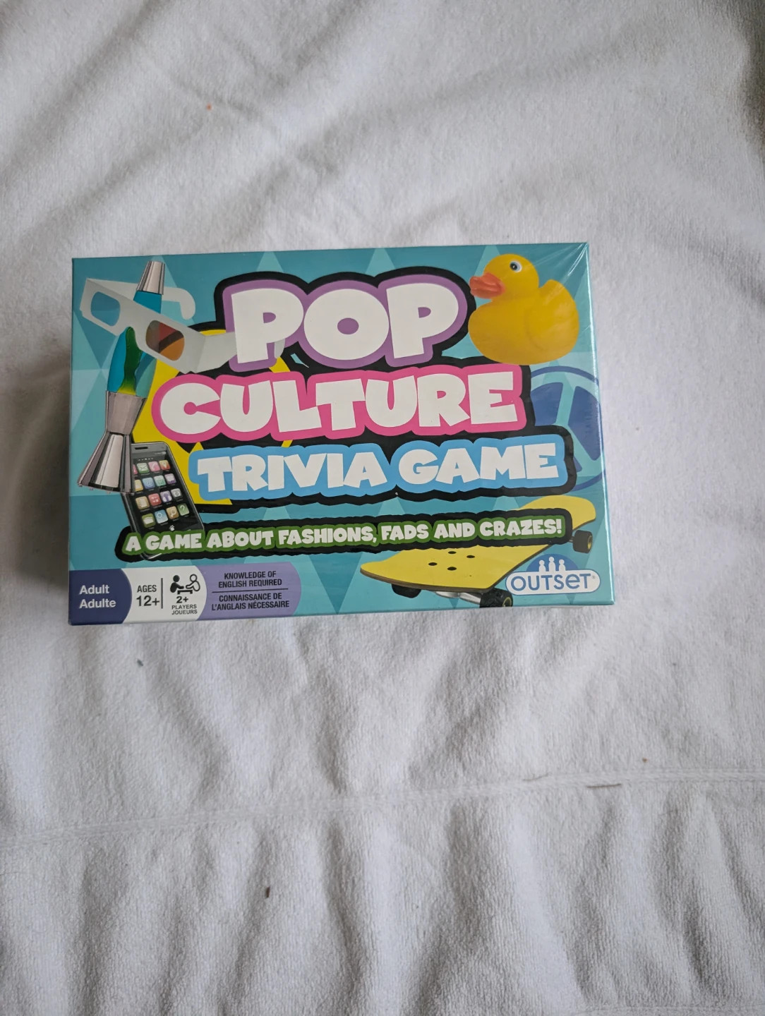 Test your knowledge of fashions, fads, and crazes with this Outset Pop Culture Trivia Game, a game about the people, products and events that have shaped our world. Hours of fun for fans of everything pop culture from Madonna and Britney Spears to Donkey Kong and Oprah. This is a newin plastic game, and is in great condition and ready for its next owner.