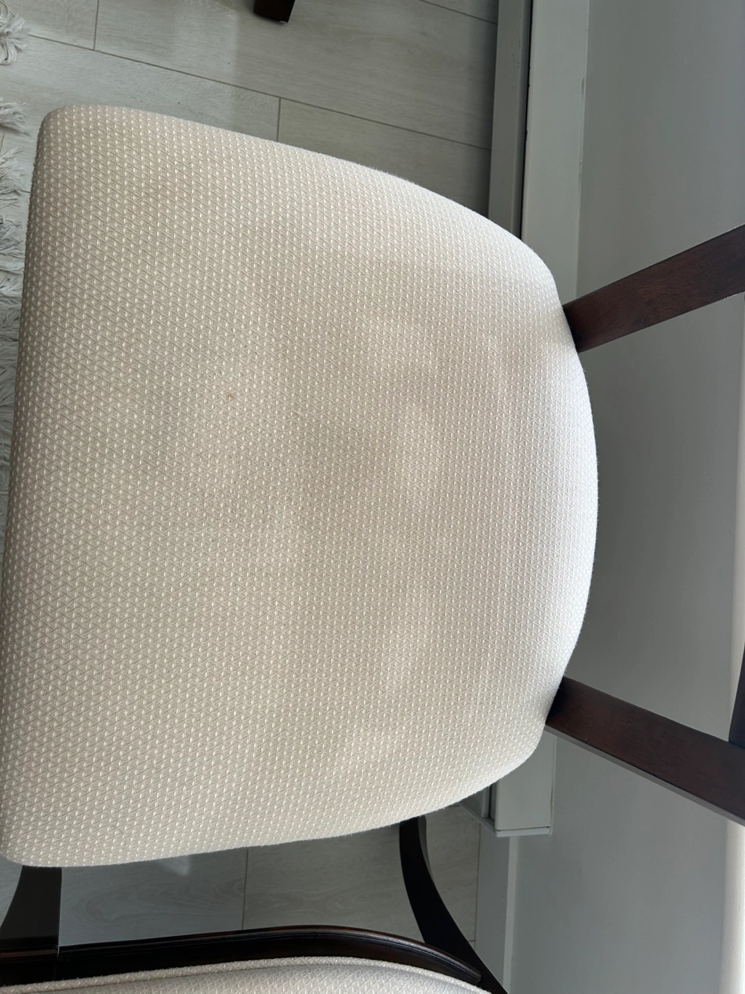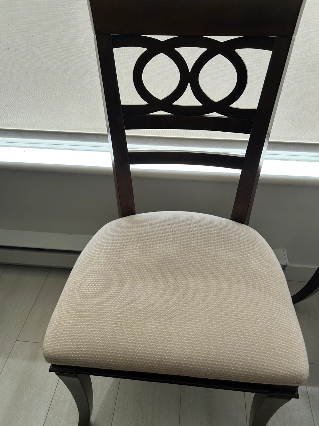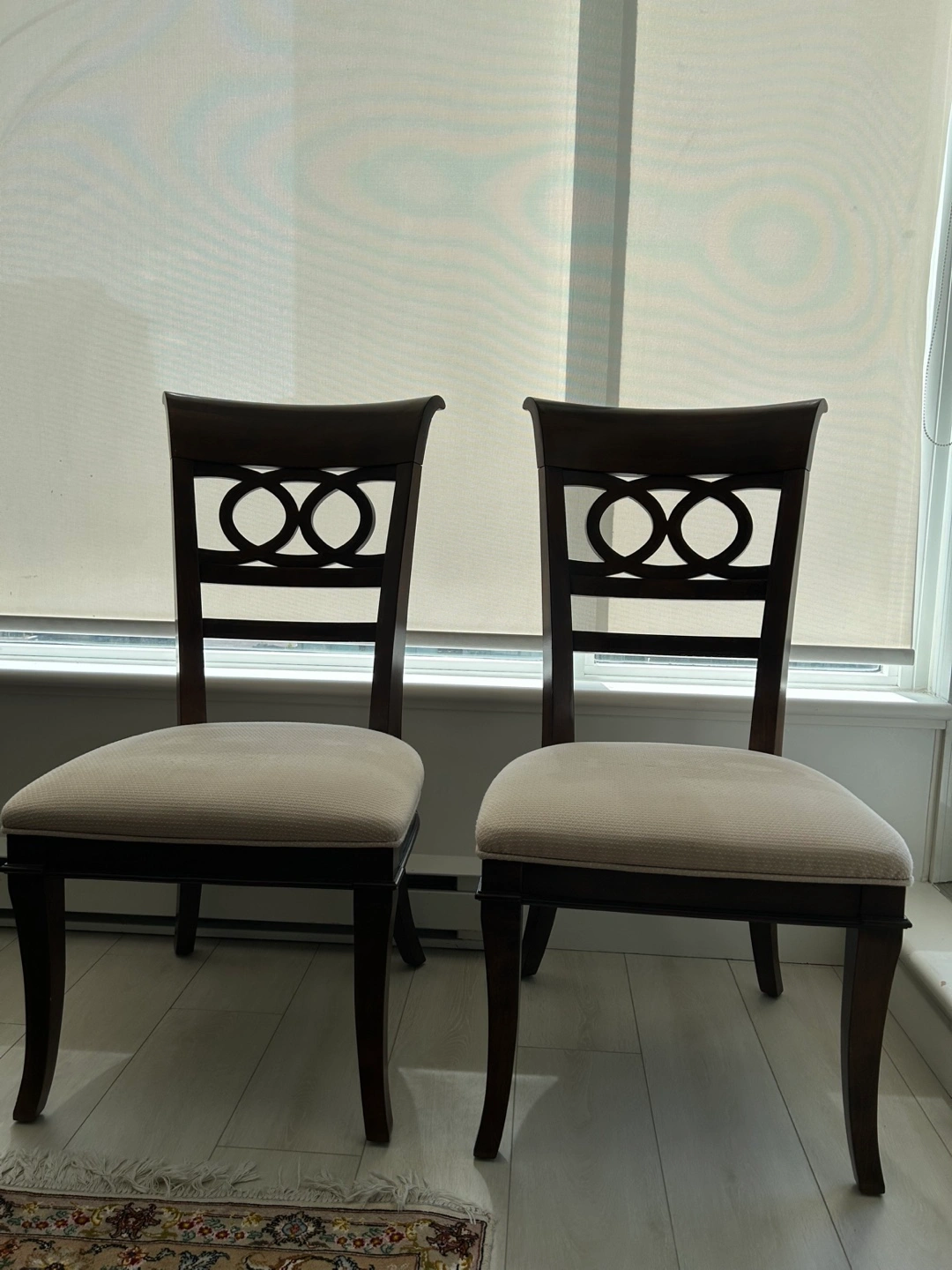 Selling a set of two dining chairs. They have a dark wood frame and a light-coloured upholstered seat. The backs feature a decorative circular design. They're in good condition and price include both chairs.