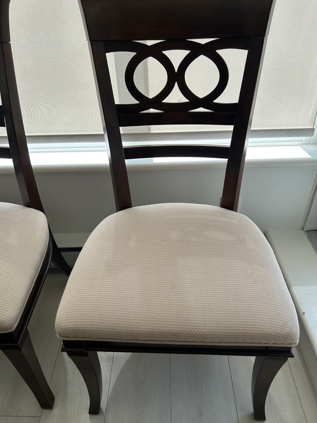 Selling a set of two dining chairs. They have a dark wood frame and a light-coloured upholstered seat. The backs feature a decorative circular design. They're in good condition and price include both chairs.