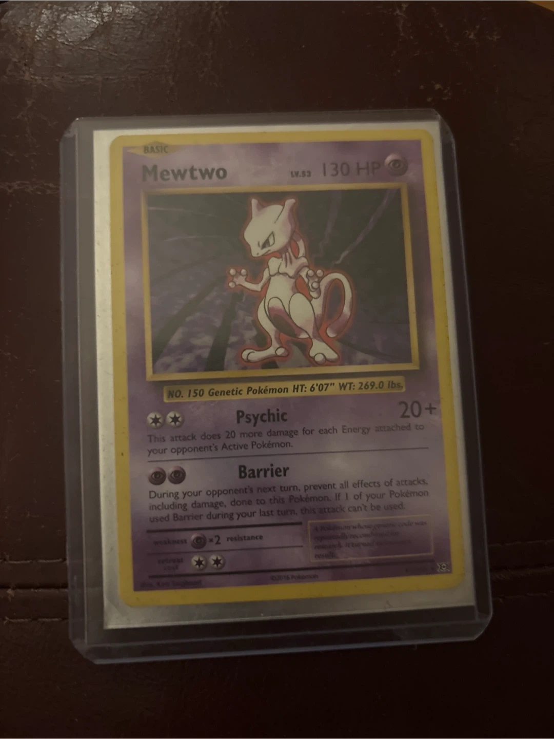 This is a 'Mewtwo' Pokémon card, featuring Psychic abilities. Its attack offers boosted damage, and the 'Barrier' move prevents effects of attacks. It has 130 HP.