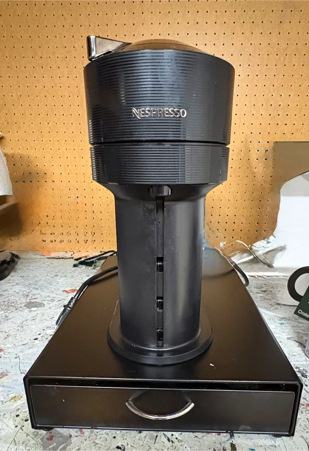 Black Nespresso coffee machine with a sleek, ribbed design. Comes with a pull-out drawer to store coffee capsules