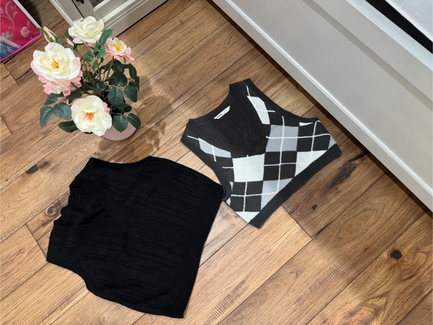 two small sweaters oversized S to wear with shirts or whatever how we want, and two brand new fitted strapless , camisole bras Size S. Everything is totally new and all in $25.