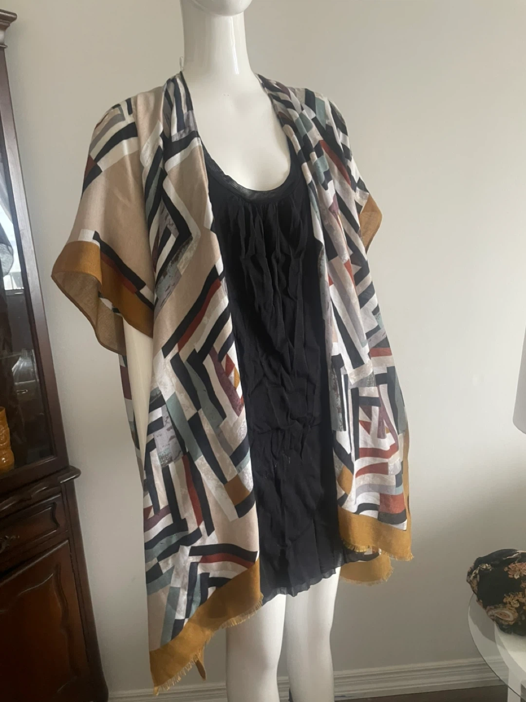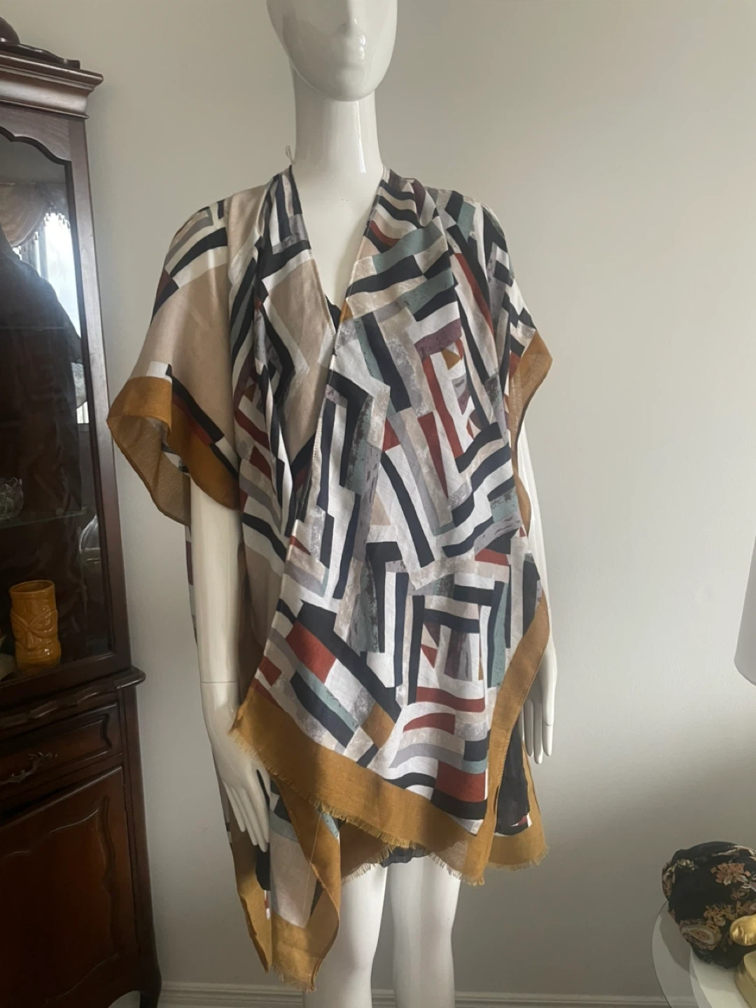 This open-front kimono wrap features a striking geometric print in shades of beige, black, white, red, and blue. It has a lightweight feel with frayed edges and a golden trim. It's perfect for layering over a simple top.