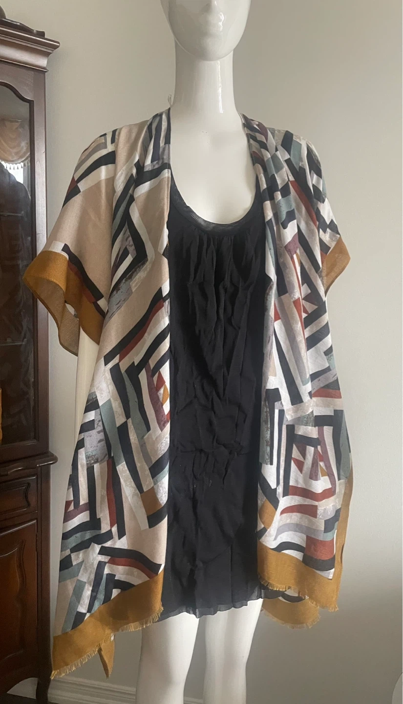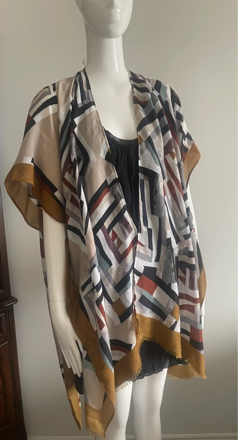 This open-front kimono wrap features a striking geometric print in shades of beige, black, white, red, and blue. It has a lightweight feel with frayed edges and a golden trim. It's perfect for layering over a simple top.