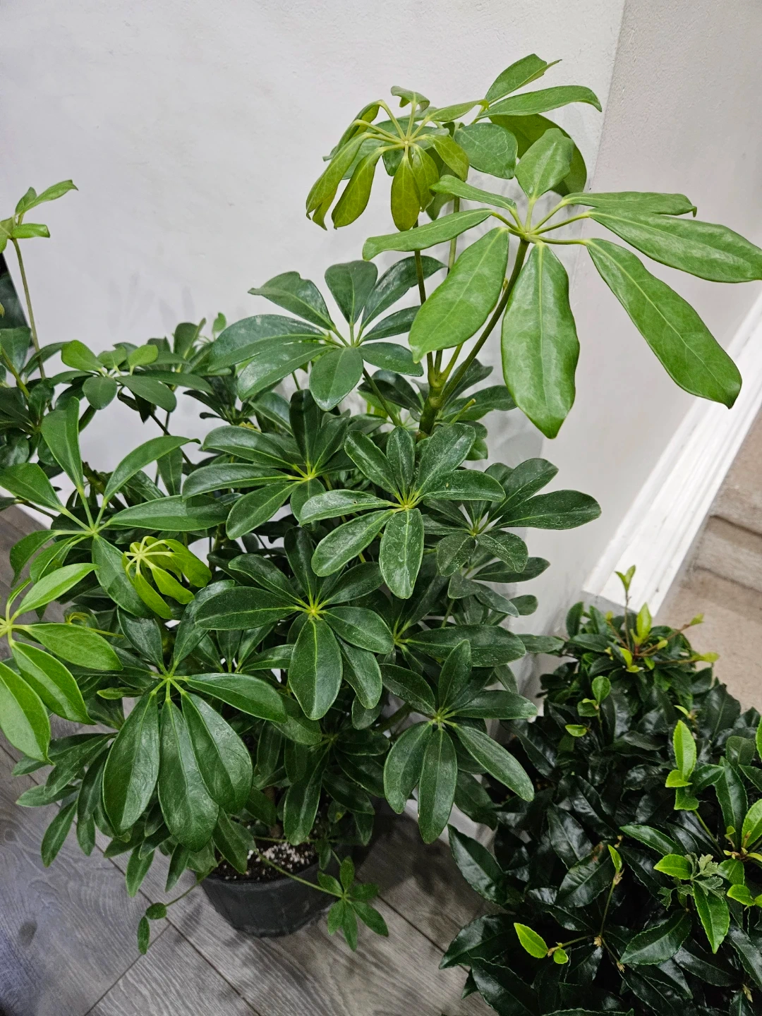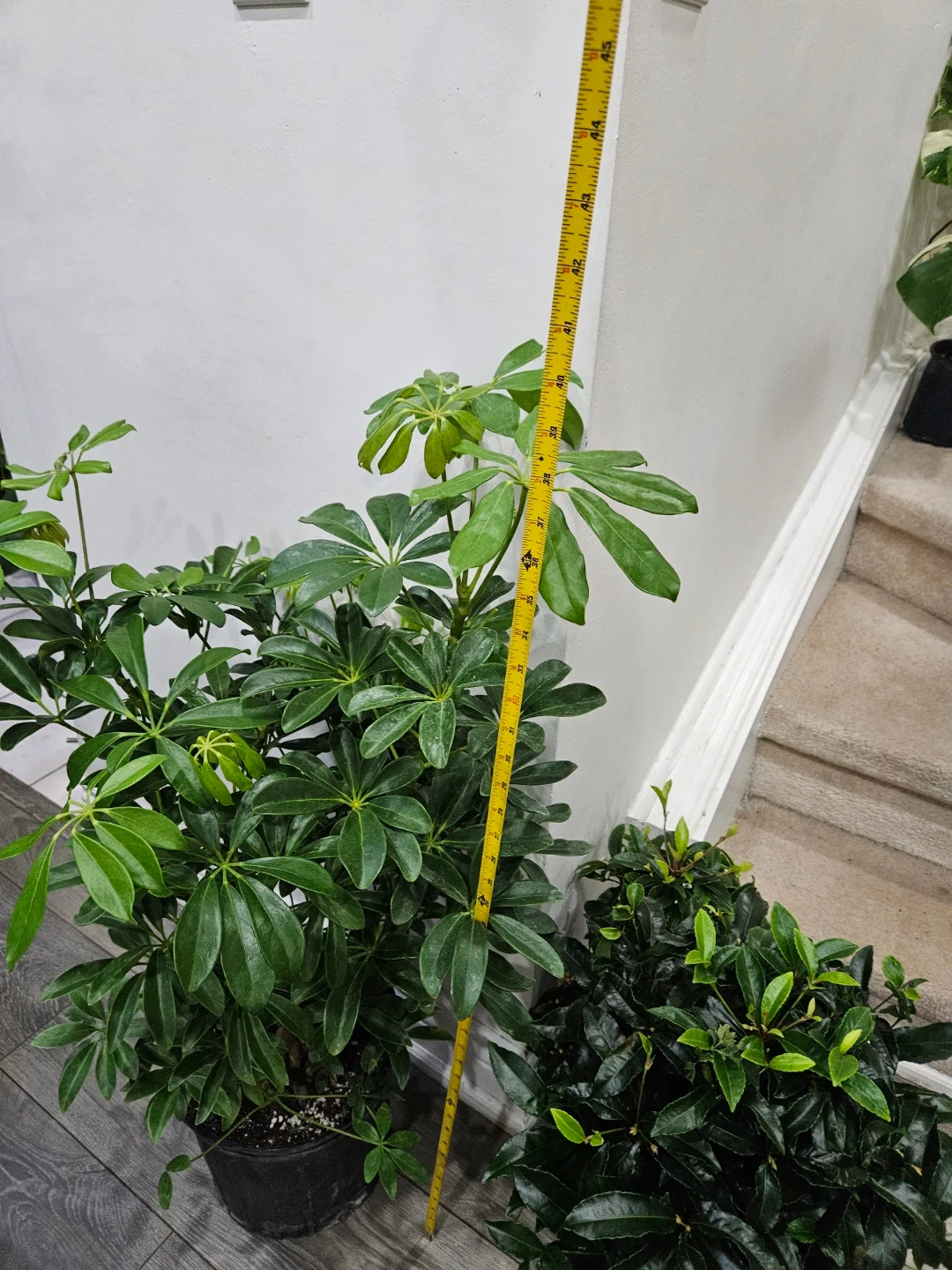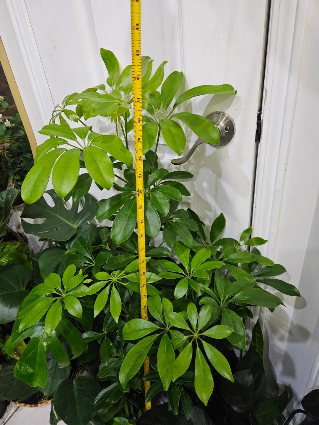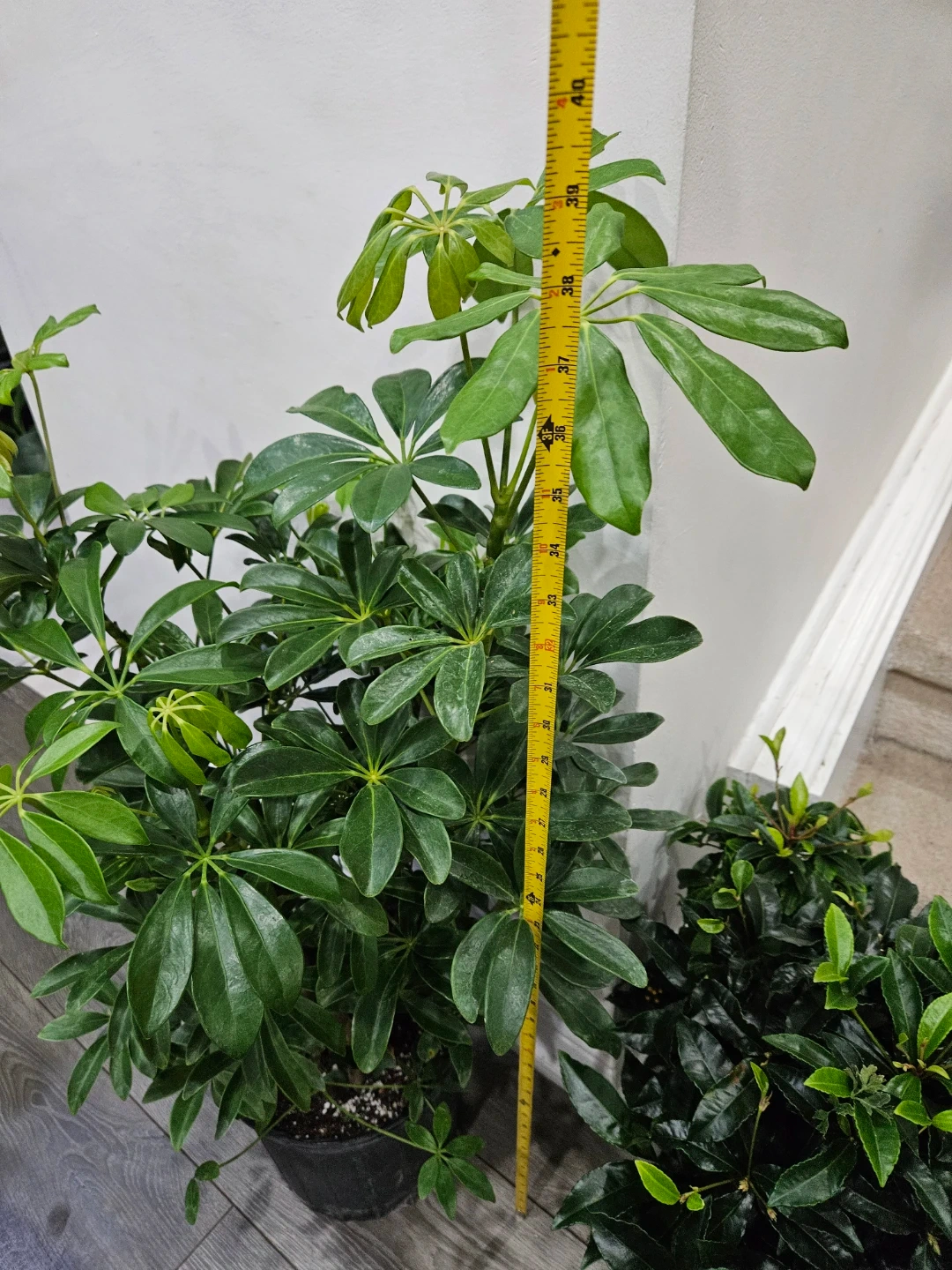 Schefflera plant in a black pot. It's approximately 37 inches tall. This plant adds a nice touch of green to any indoor space.