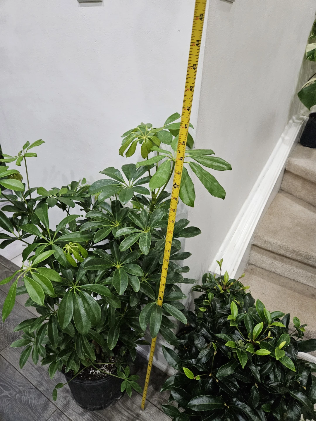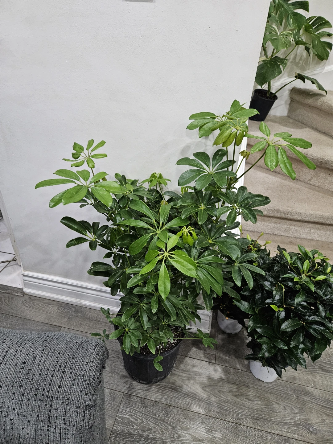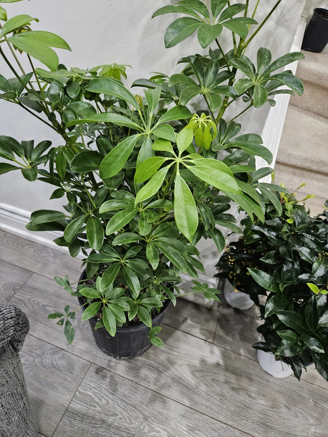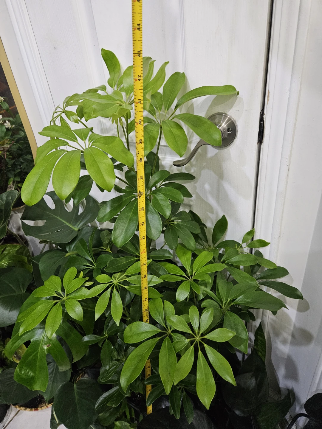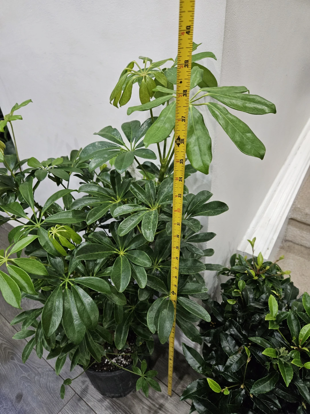 Schefflera plant in a black pot. It's approximately 37 inches tall. This plant adds a nice touch of green to any indoor space.