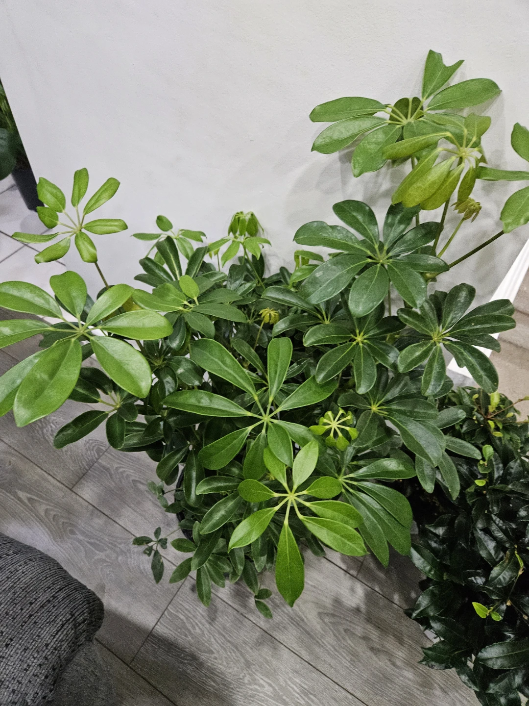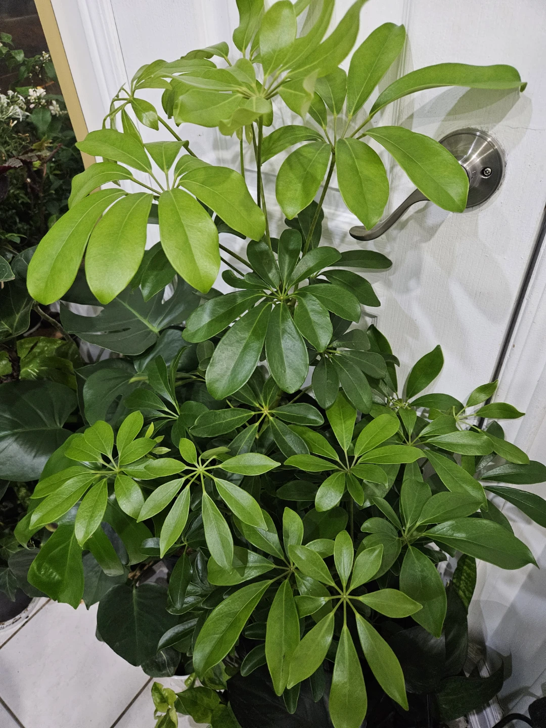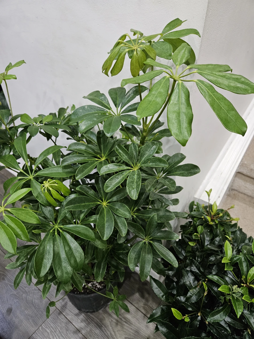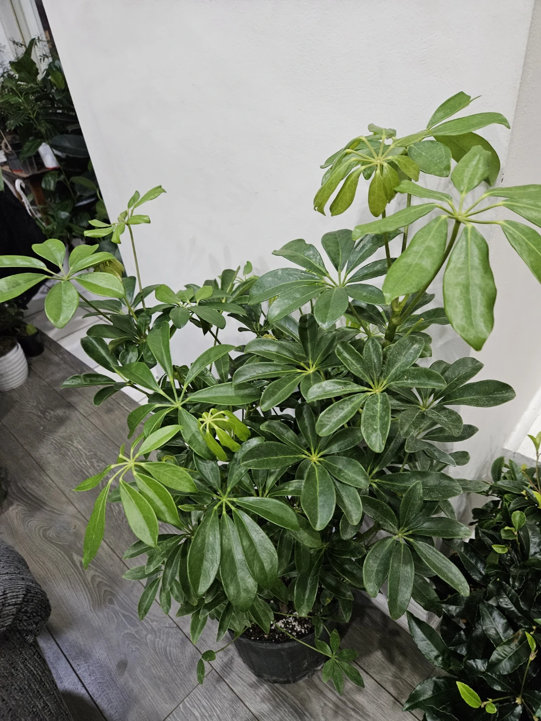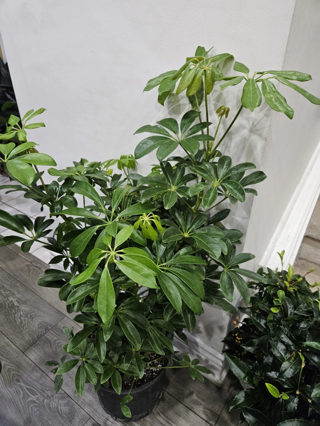 Schefflera plant in a black pot. It's approximately 37 inches tall. This plant adds a nice touch of green to any indoor space.