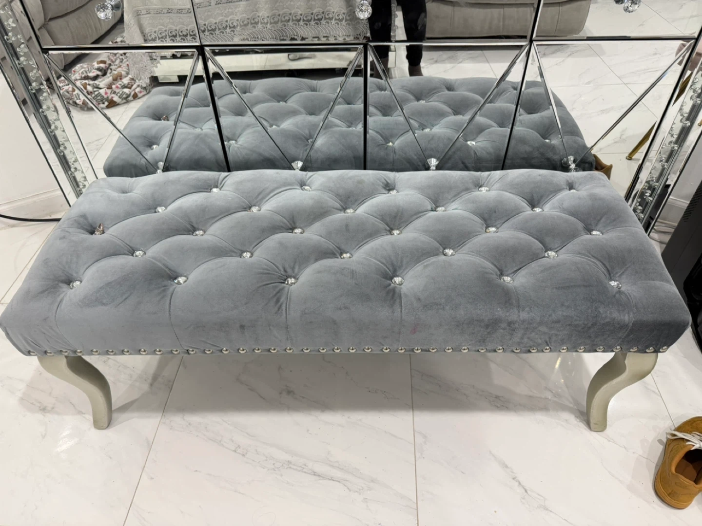 This elegant tufted ottoman bench features a plush velvet upholstery in a chic grey color. It's adorned with sparkling crystal tufting and a decorative nailhead trim along the base. The bench rests on ornate, curved legs, adding a touch of sophistication to any room. Its compact size makes it a versatile accent piece.