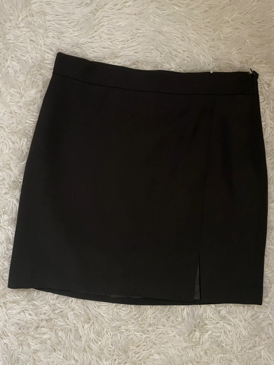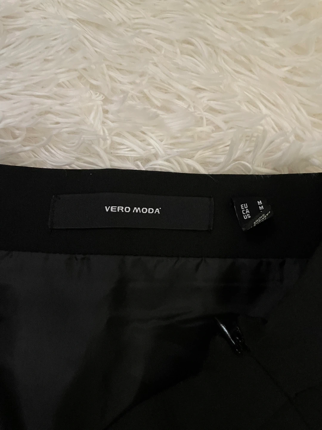 This is a black mini skirt from VERO MODA. It's a size medium and has a stylish side slit. It's made from a classic fabric blend, perfect for everyday wear.