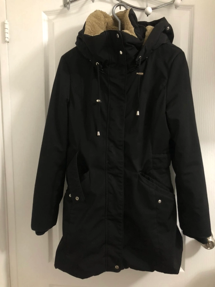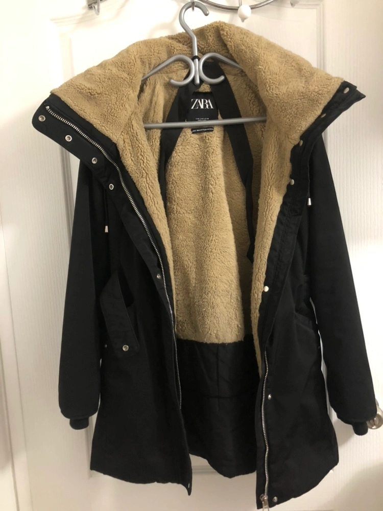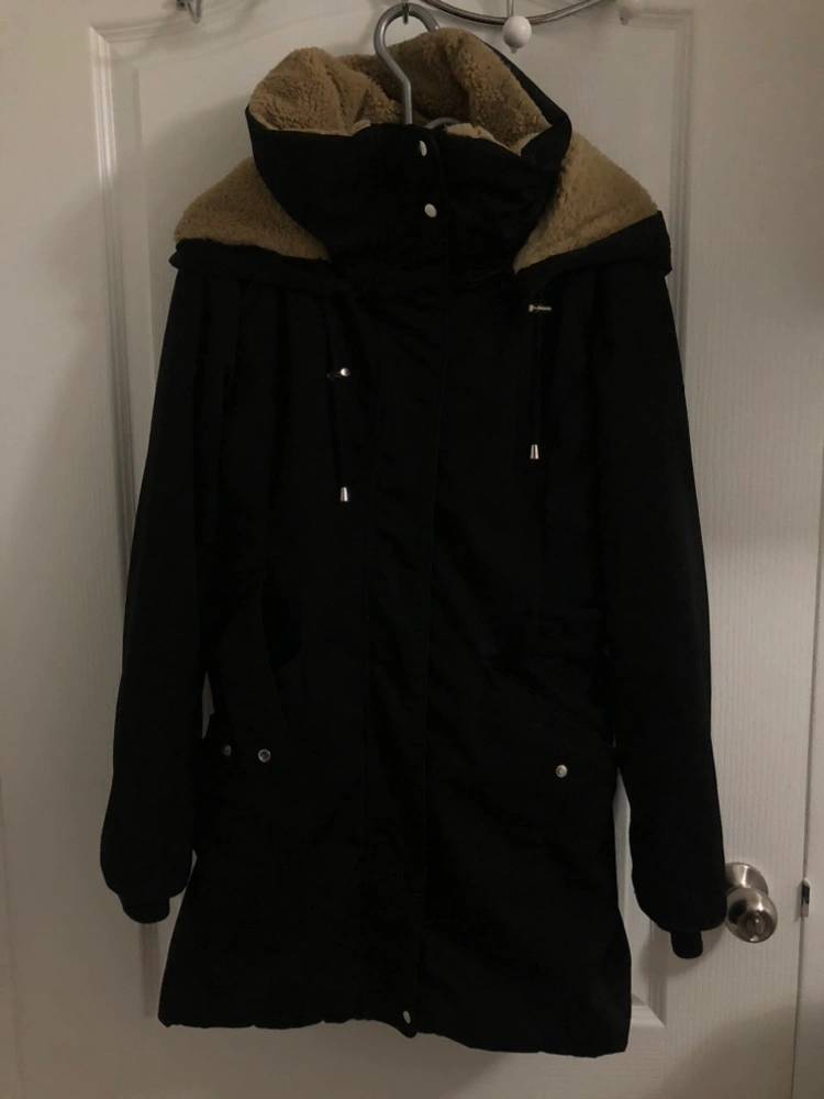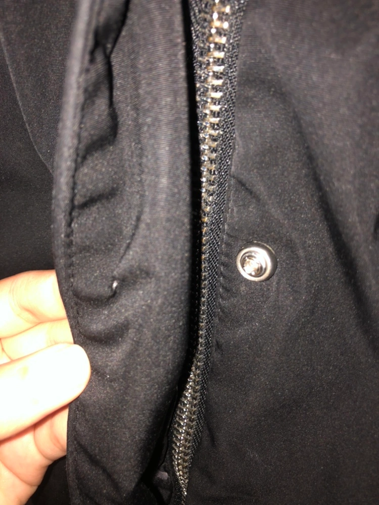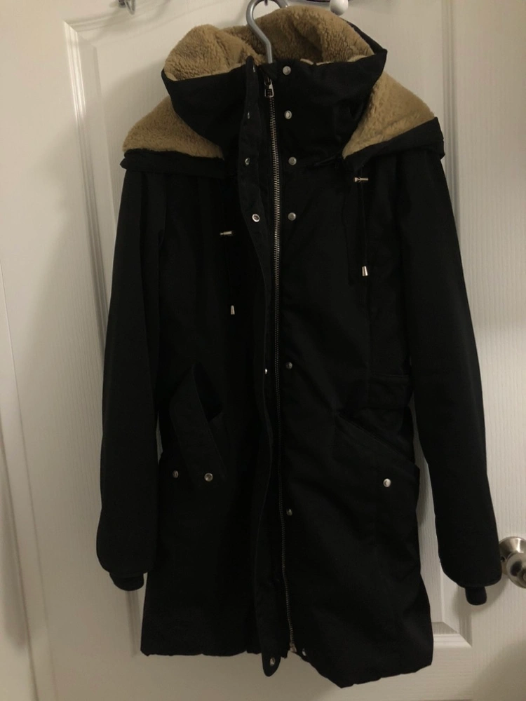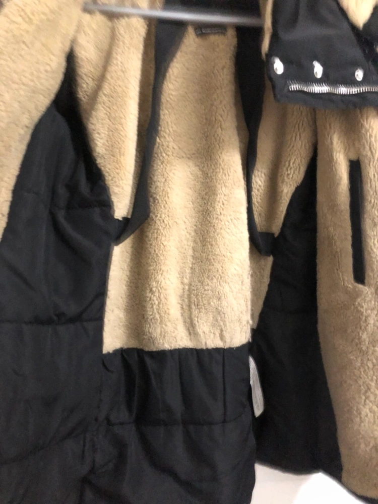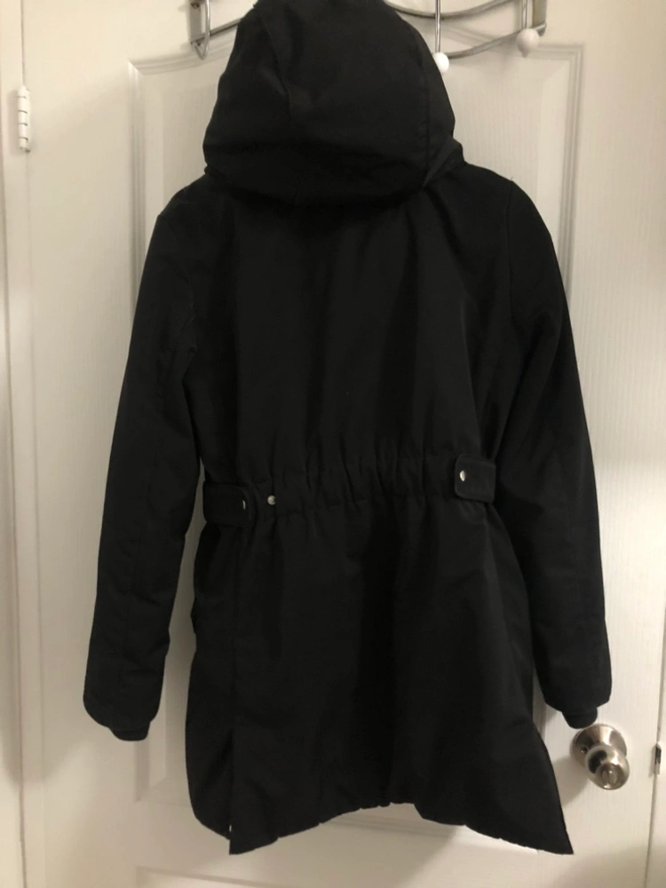 Features thick layers, back pack carry straps, zippers and button, interior pocket, chin-high coverage, hood with extra neck warmth protection, hood strings, waist cinch adjustment and thick cuffs