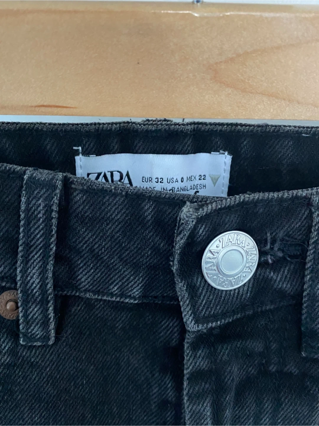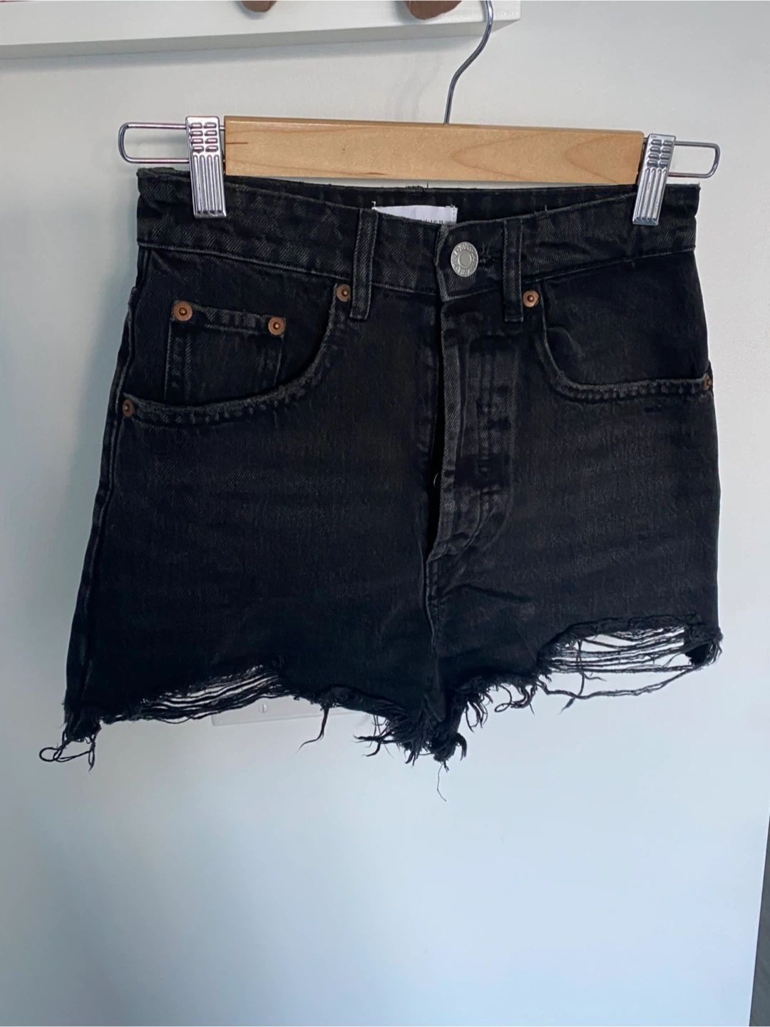These are Zara black denim cut-off shorts. They're a size 32 EUR, 0 USA, and 22 MEX. They have a distressed hem detail.