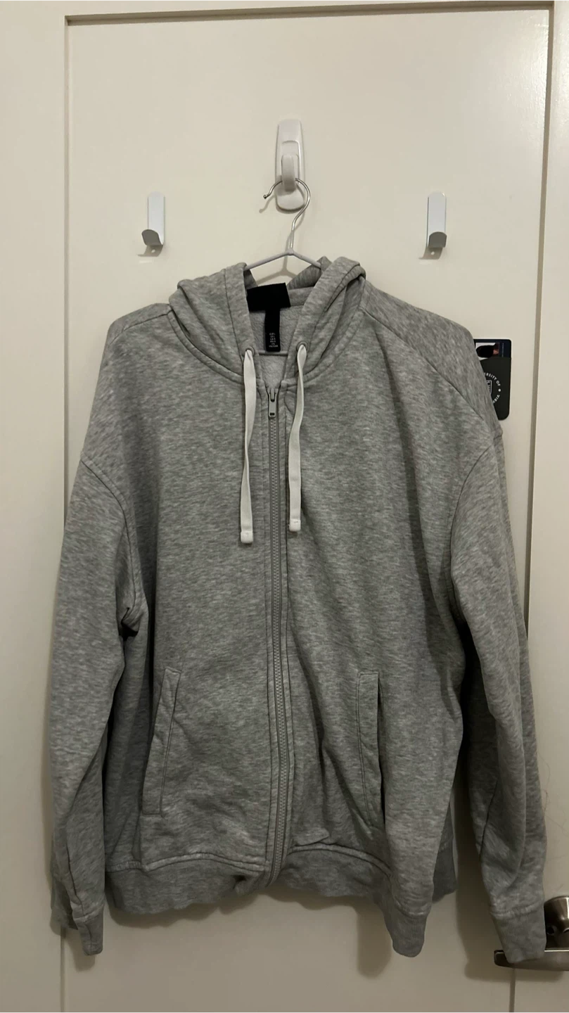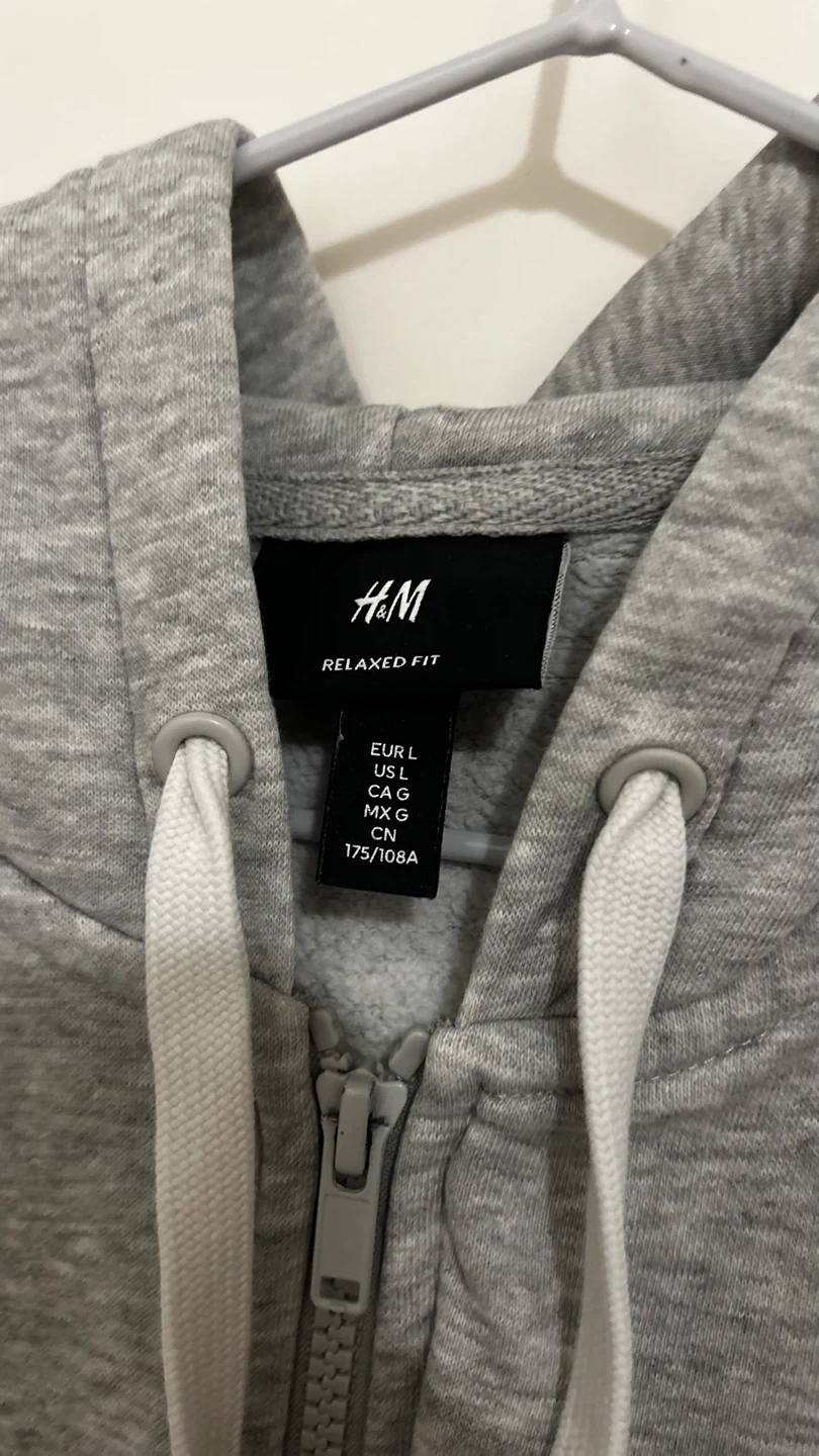 Selling a comfy H&M zip-up hoodie in light grey! It's a relaxed fit and size L. Perfect for layering or just lounging around in