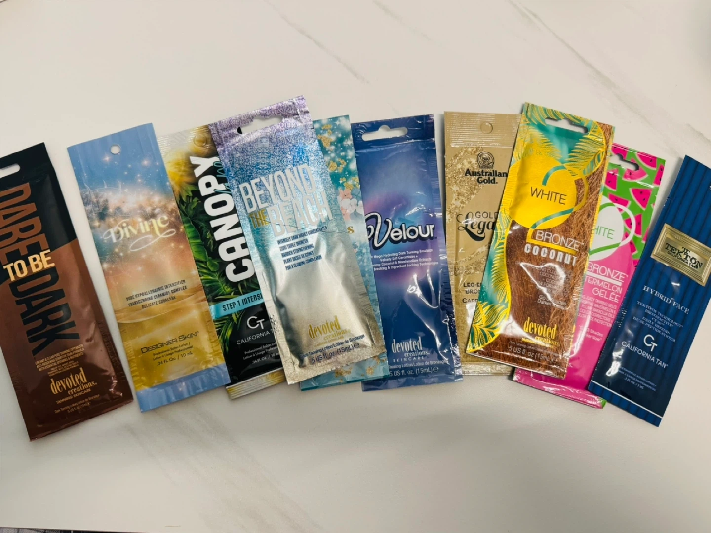 Collection of seven tanning lotions and intensifiers from various brands. Includes samples from Devoted Creations, Designer Skin, California Tan, and Australian Gold. Sizes range from 10mL to 15mL. Perfect for trying out different formulas!