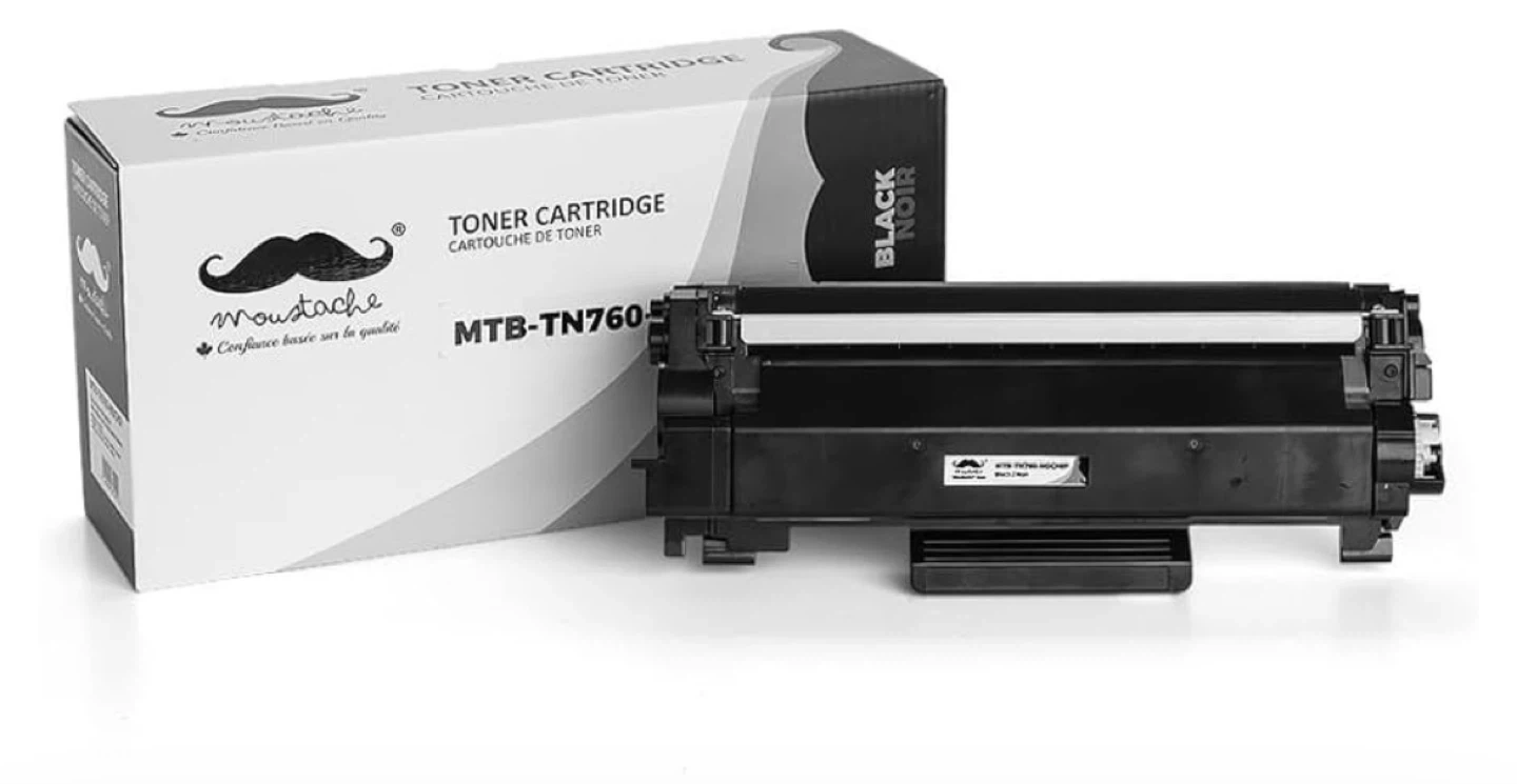 This Moustache toner cartridge is for black ink. It's a model MTB-TN760. This would be useful for anyone needing a replacement toner cartridge for their printer.