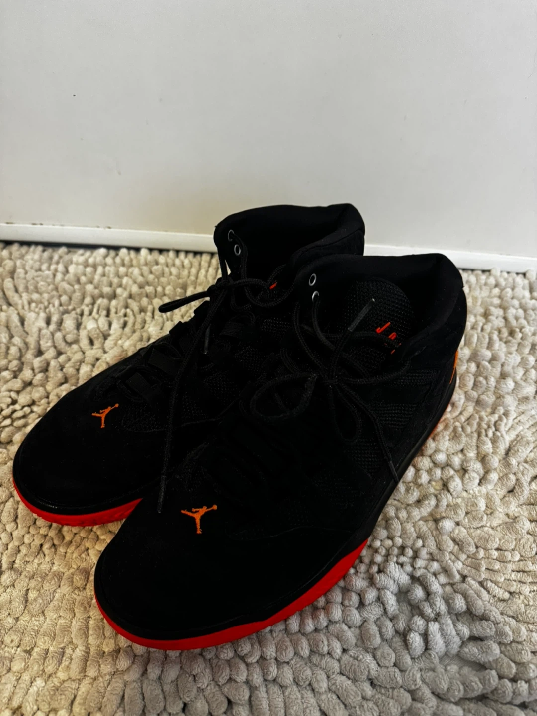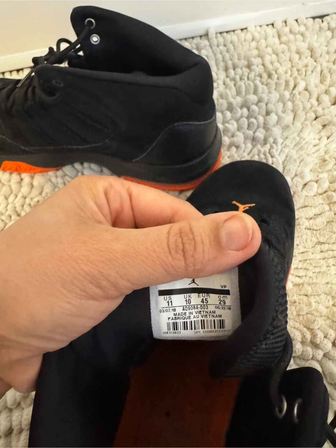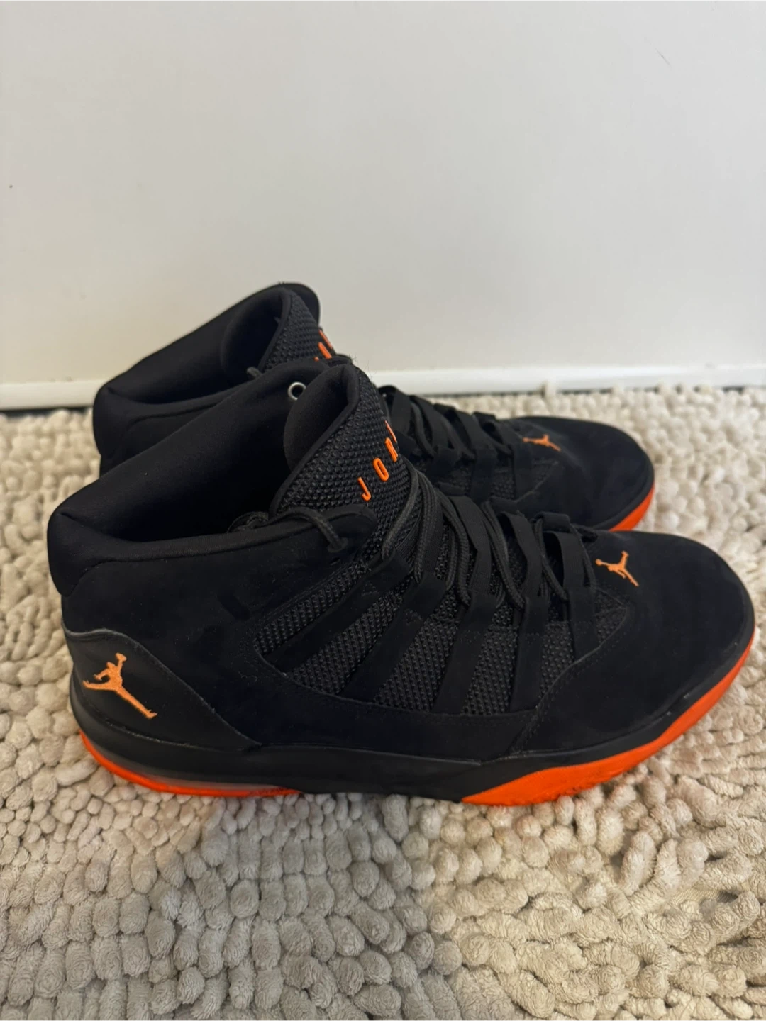Jordan basketball shoes, designed in a sleek black and vibrant orange colourway, and marked as a size 11.