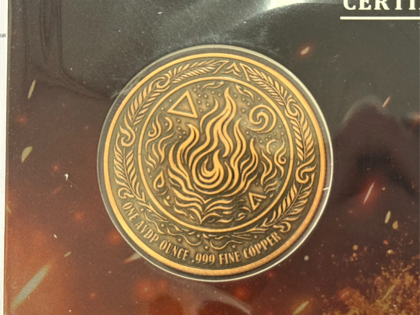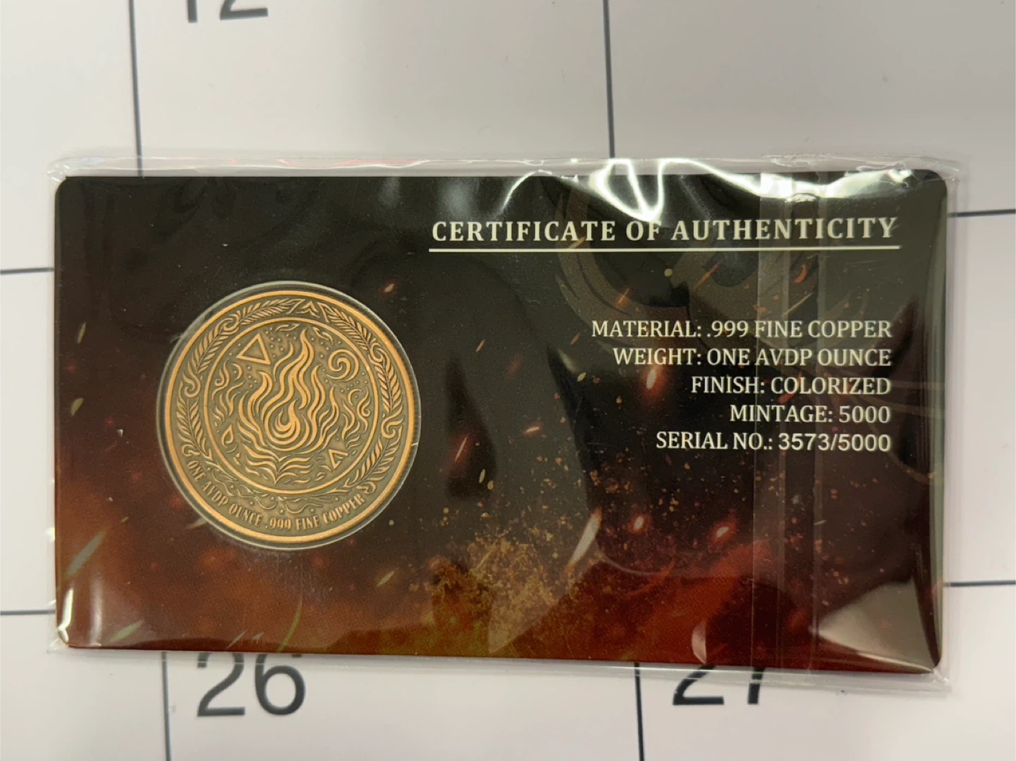 This is a colorized coin featuring a phoenix design. It's made of .999 fine copper and weighs one avoirdupois ounce. The mintage for this coin is 5000 and every essay is numbered
